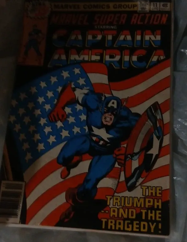 Selling a Marvel Super Action comic book featuring Captain America. It's issue number 11 and appears to be from the Marvel Comics Group. The cover says "The Triumph and the Tragedy!"