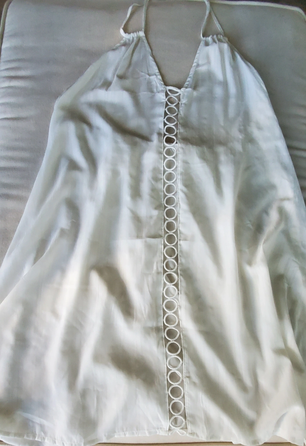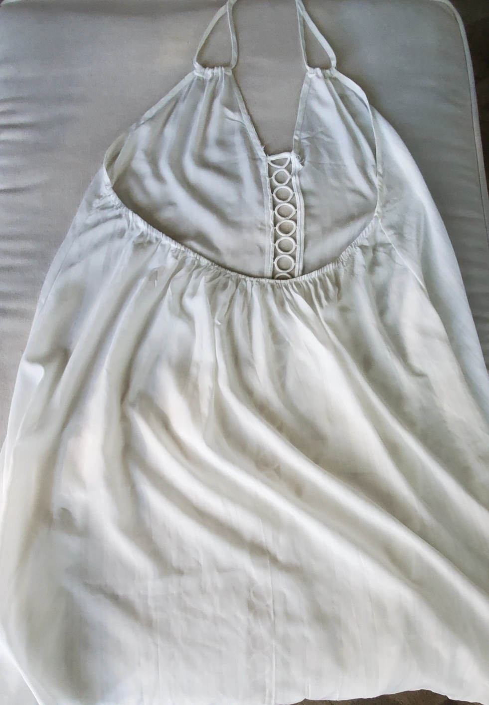 New with tag. Fits more like an extra large. Halter. Material 65% Rayon, 35% Pokyester. Color White.