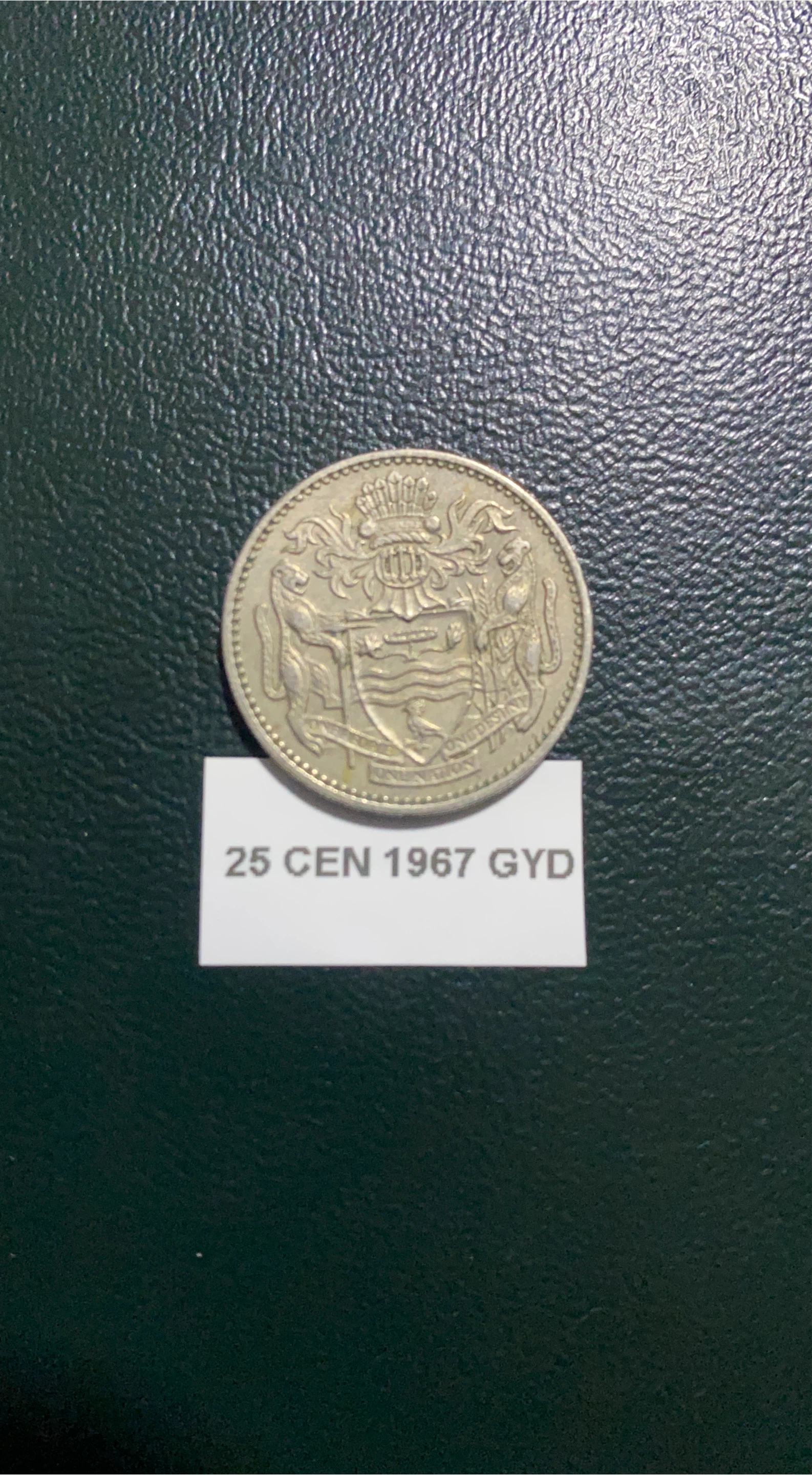 Selling a 25 cent coin from 1967. It has the text '25 CEN 1967 GYD' on it.