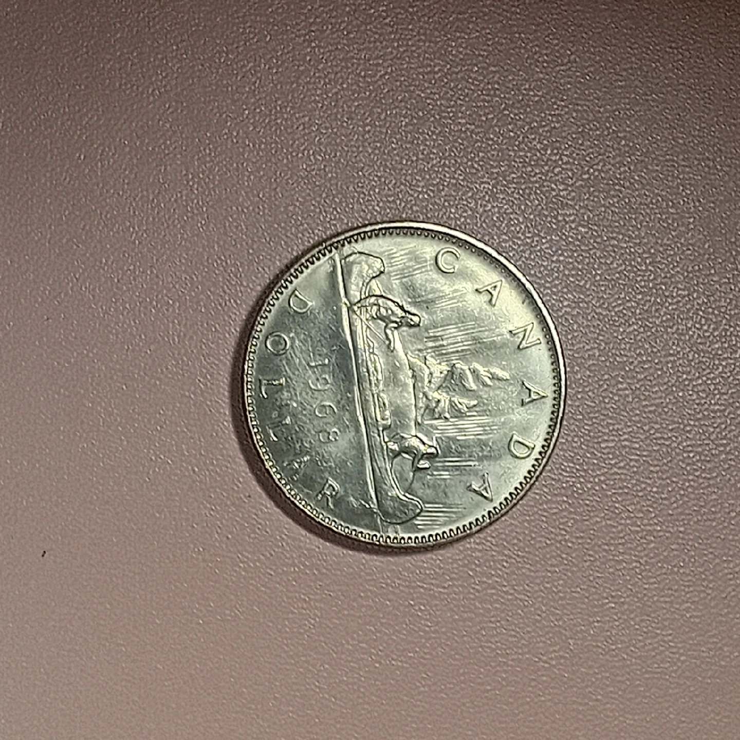Selling a 1968 Canadian silver dollar. It features Queen Elizabeth II on one side and a canoe scene on the other. A great piece for collectors!