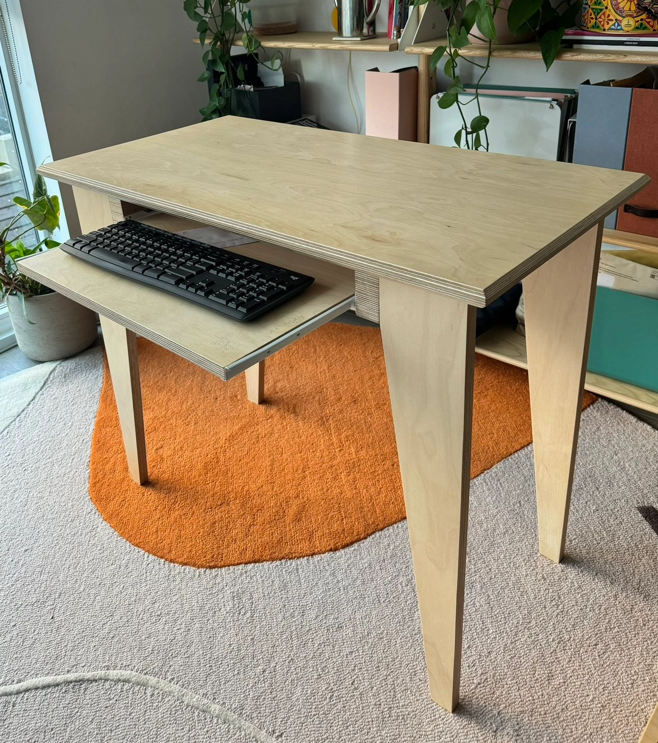 Designed and built by a carpenter in the GTA, has a keyboard track that can be pulled out or tucked back into the desk.