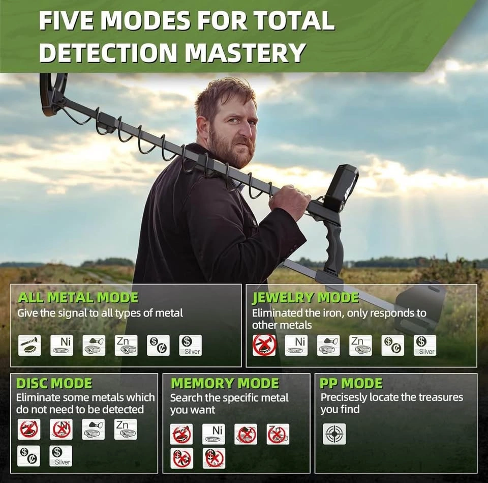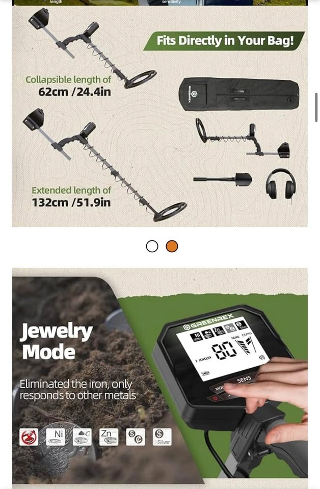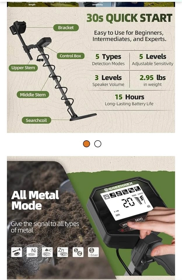 Brand new, never assembled GreenRex Metal Detector for Adults Professional. Waterproof pinpoint, high accuracy for gold and silver detection. Suitable for underwater and beach use. Features a 10'' IP68 coil, bigger LCD, and a new advanced DSP chip. The GreenRex Metal Detector has 5 upgraded modes for precise, efficient metal detection. Find coins, relics, jewelry, or gold. Adjustable length up to 132 cm, fits adults and kids. Compresses to 62 cm for easy travel. Includes 5 sensitivity levels to adapt to different ground conditions. Comes with premium headphones, a foldable shovel, batteries, and a carrying bag.