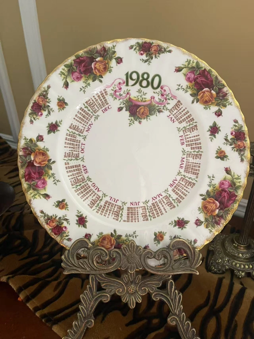 Vintage Royal Albert Old Country Roses commemorative plate. Features a 1980 calendar. Gold-gilded edges. Roses and floral design. Excellent condition.
