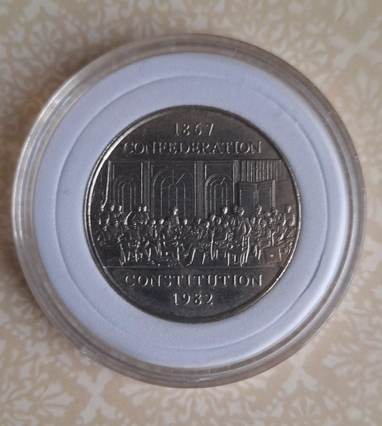 Selling a 1982 Canadian dollar coin. It commemorates the Constitution and Confederation of 1867. A great piece for collectors!