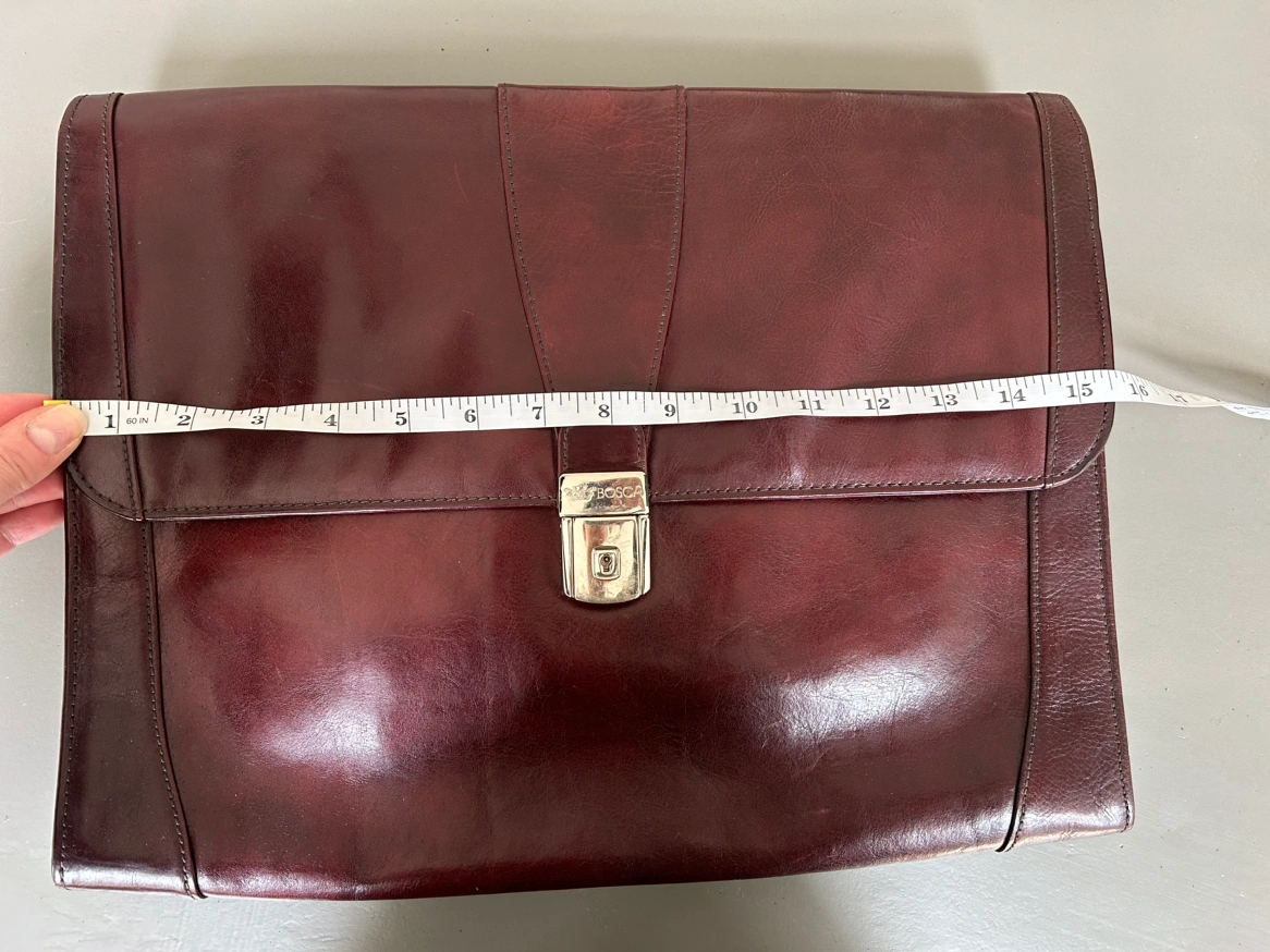 Gorgeous luxurious Bosca briefcase in beautiful leather. Comes with a key and a functional lock! It is a quality piece. Magnetic clasp hidden in the back pocket. Very clean. Measurements in pics. A strap can be added.