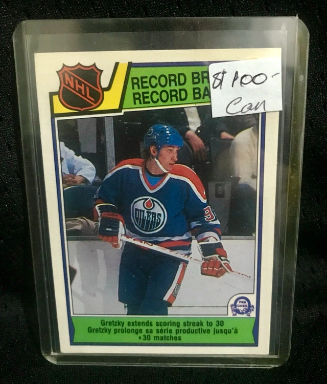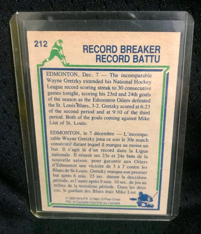208I'm offering a 1983-84 O-Pee-Chee #212 Wayne Gretzky Record Breaker hockey card, a fantastic addition to any collection! This card commemorates Gretzky's incredible scoring streak. * Card Number: 212 * Player: Wayne Gretzky * Team: Edmonton Oilers * Year: 1983-84 * Brand: O-Pee-Chee If you're reading this, the card is still available – ready to find a new home with a fellow hockey enthusiast!