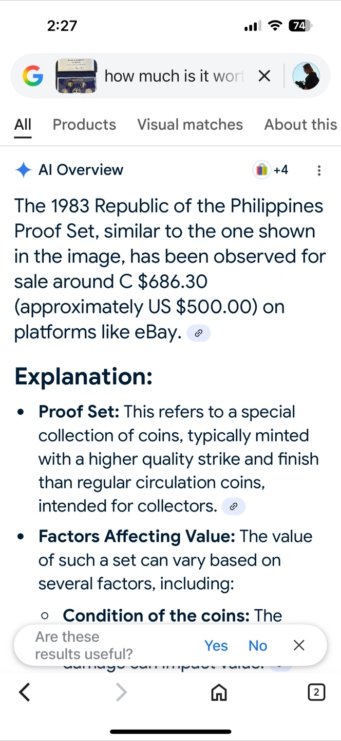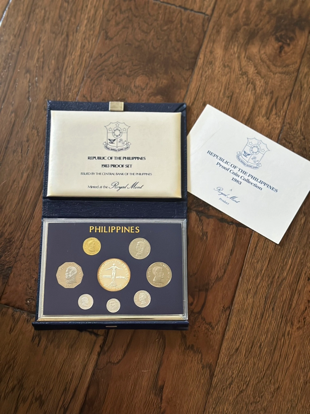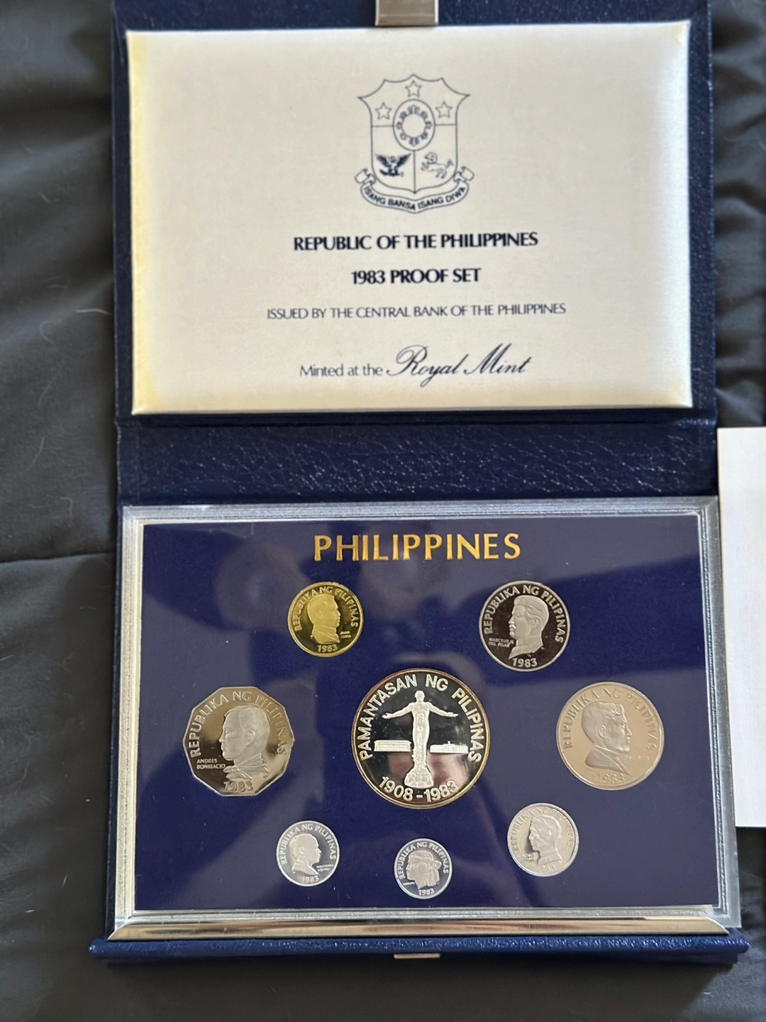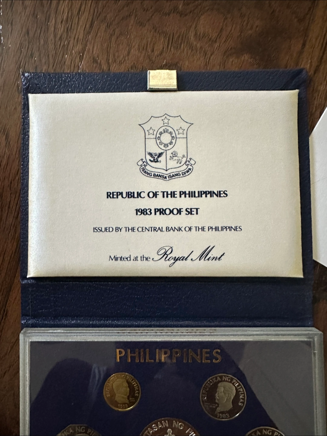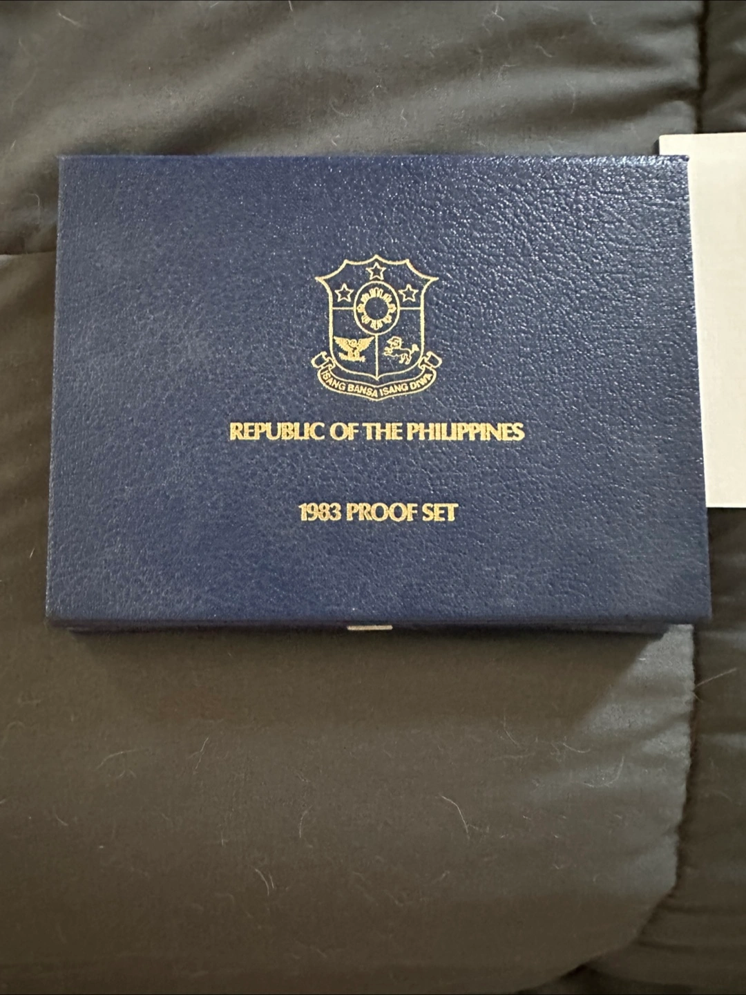 Selling a 1983 Republic of the Philippines Proof Set. It was issued by the Central Bank of the Philippines and minted at the Royal Mint. A similar set has been observed for sale around C$686.30 on platforms like eBay. Proof sets are special collections of coins, typically minted with a higher quality strike and finish than regular circulation coins, intended for collectors