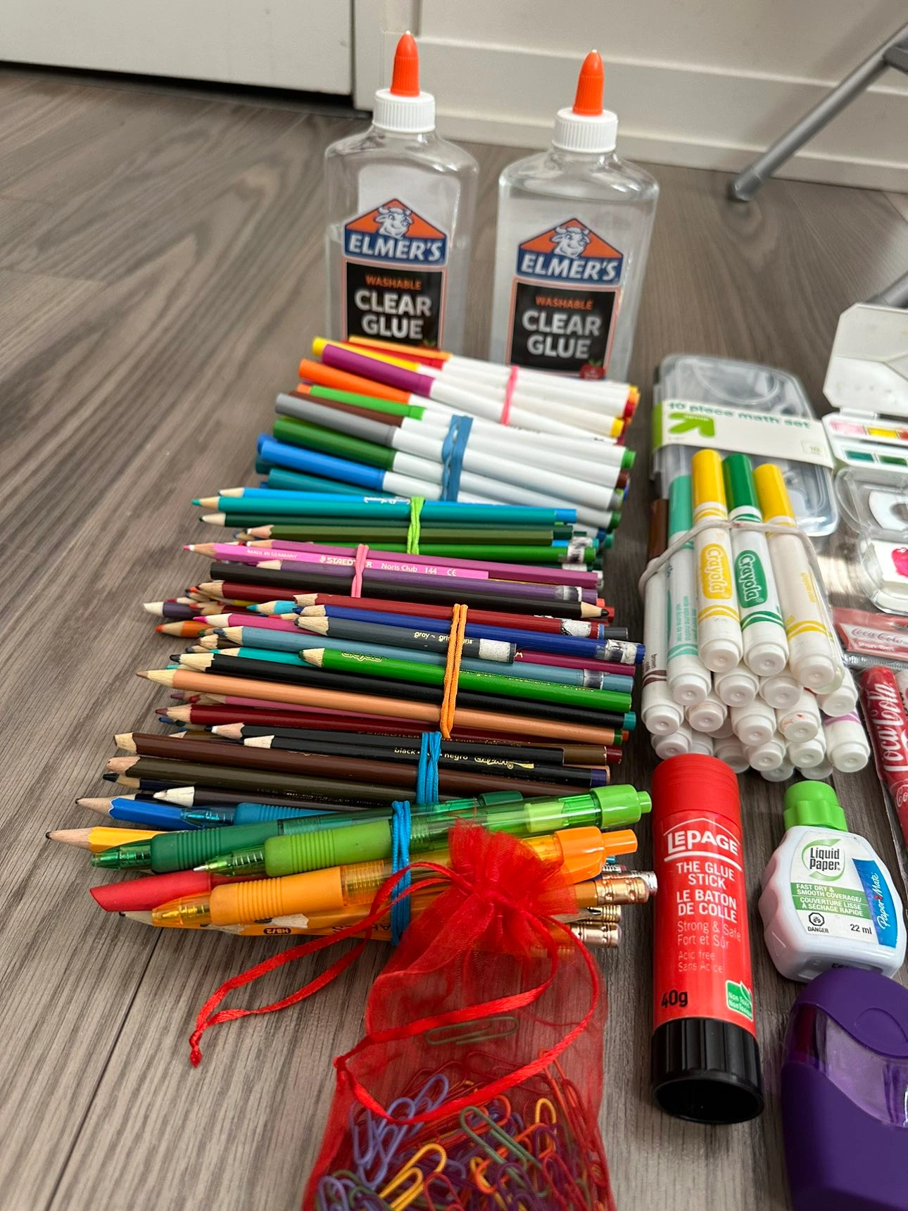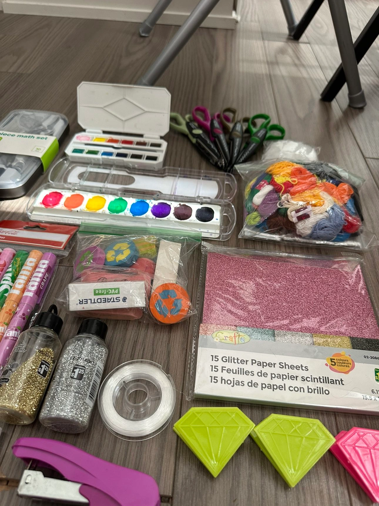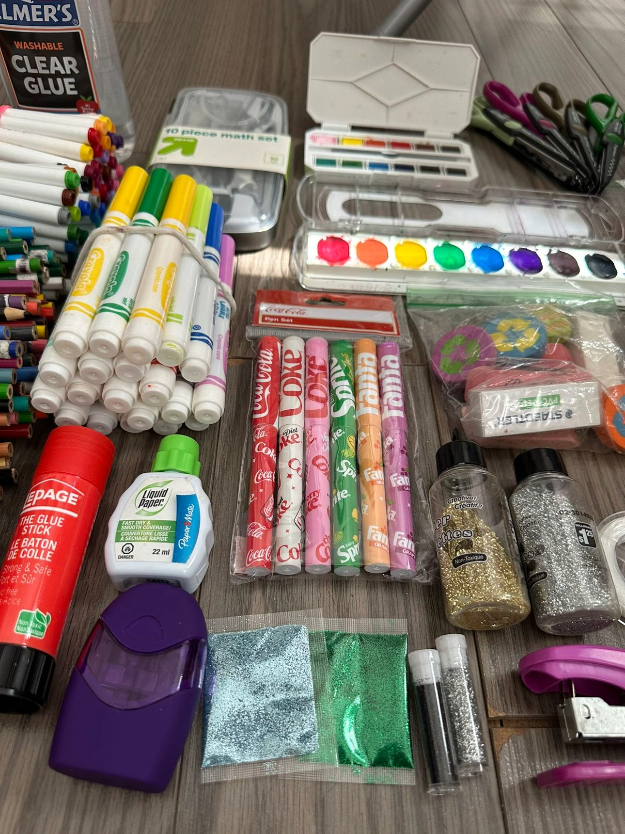Glue, crayola markers, pencil crayons, pencils, glue stick, white out, pencil sharpener, glitter, glitter sheets, stapler, string, erasers, clips, paint, scissors with multiple cutting shapes, 10 piece math set all worth more than 100 selling for 50!