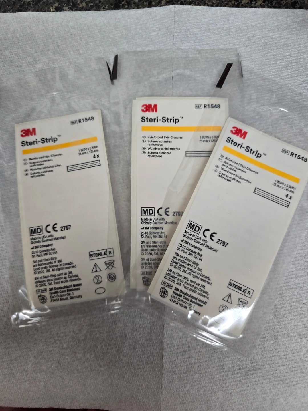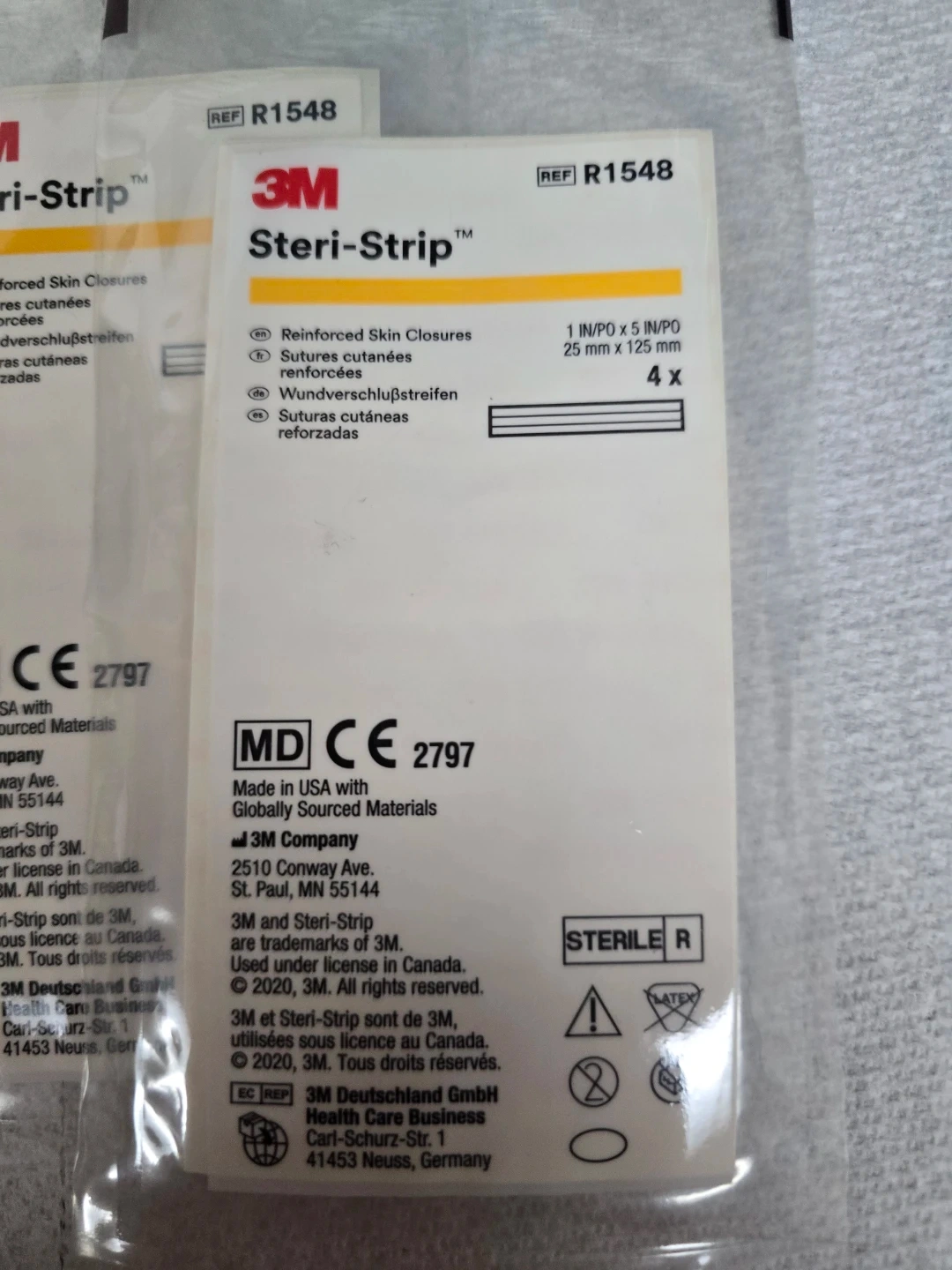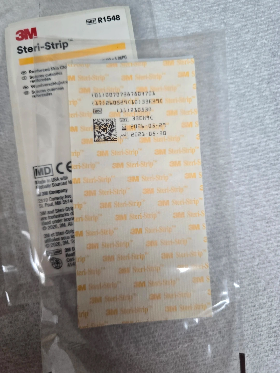 This is a package of 3M Steri-Strip Reinforced Skin Closures. Each package contains 4 strips, measuring 25 mm x 125 mm. They are sterile and made in the USA with globally sourced materials. The expiration date is 2026-05-29.