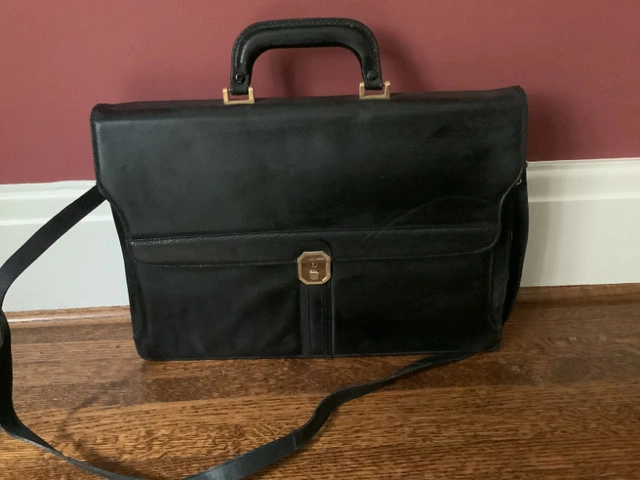 Black Leather Attache Case from the early 1990's. Measures 16" across by 12" down. Divided sections would allow for storage of laptop plus file folders. Security lock included. Excellent condition.
