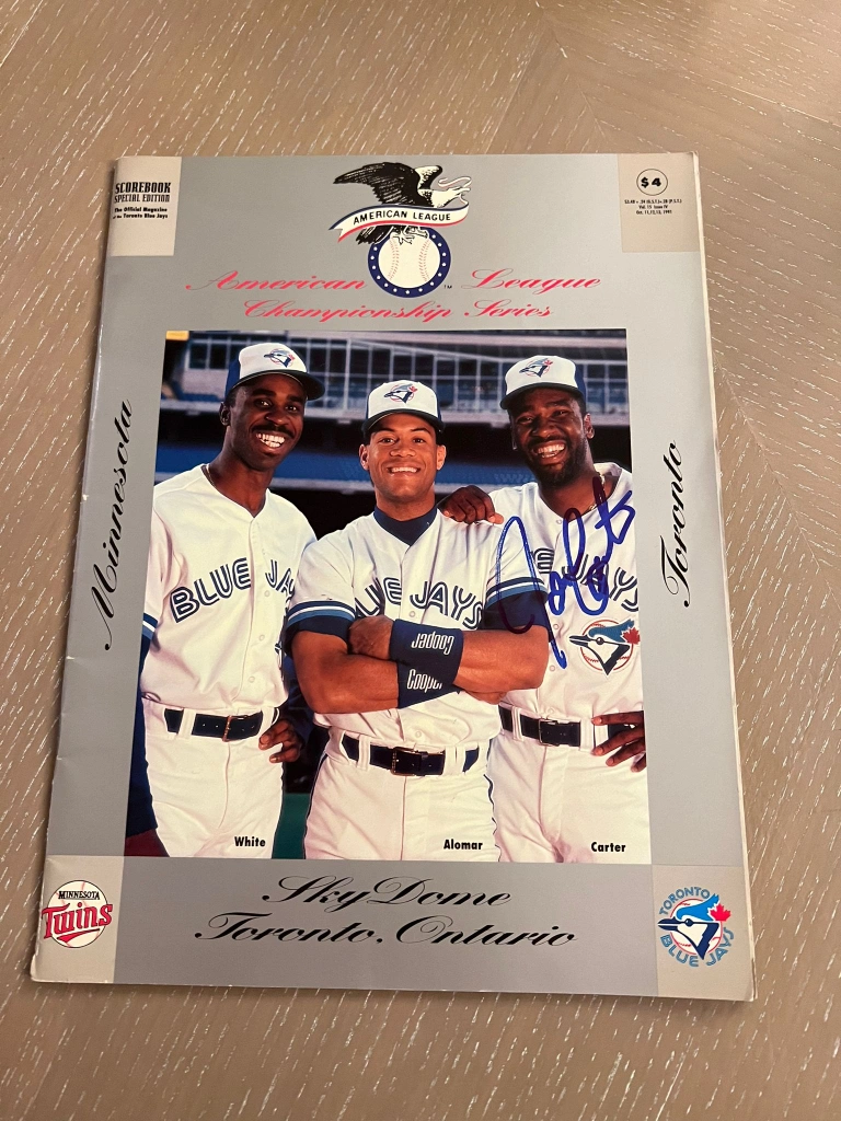 7511991 ALCS Toronto Blue Jays Joe Carter Signed Program Autographed Cover Toronto Blue Jays vs Minnesota Twins. Sky Dome Toronto Canada. American League Conference Series.