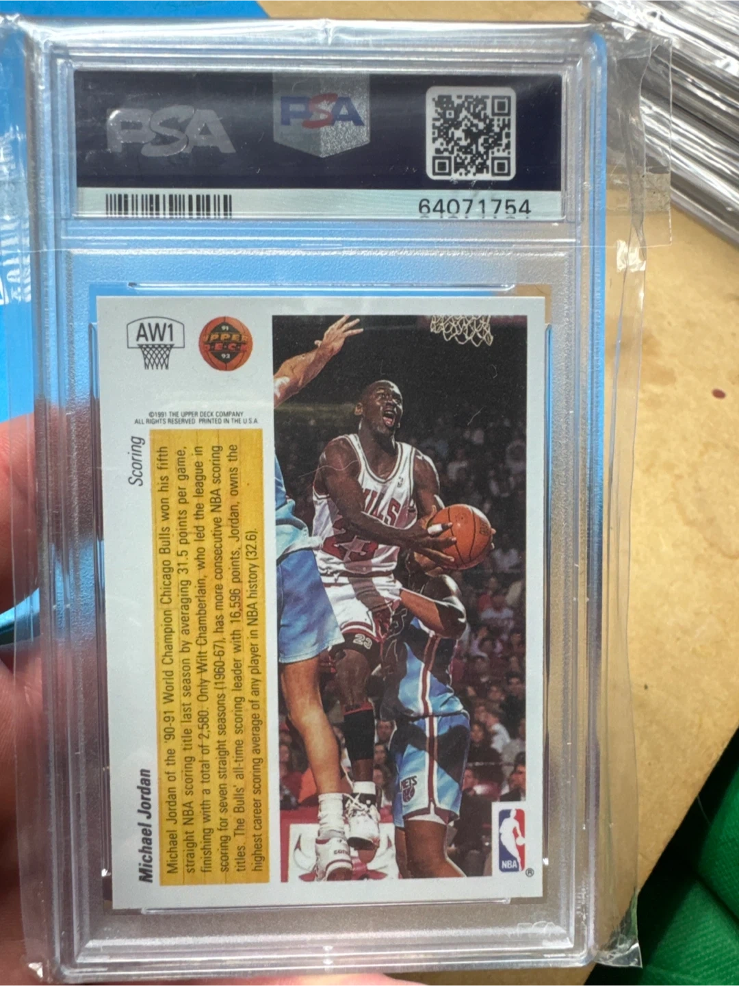 Selling a 1991 Upper Deck (U.D.) Award Winner Michael Jordan Hologram card, graded PSA 8! This card commemorates Michael Jordan's achievements and features a cool hologram effect. A great addition to any basketball card collection!