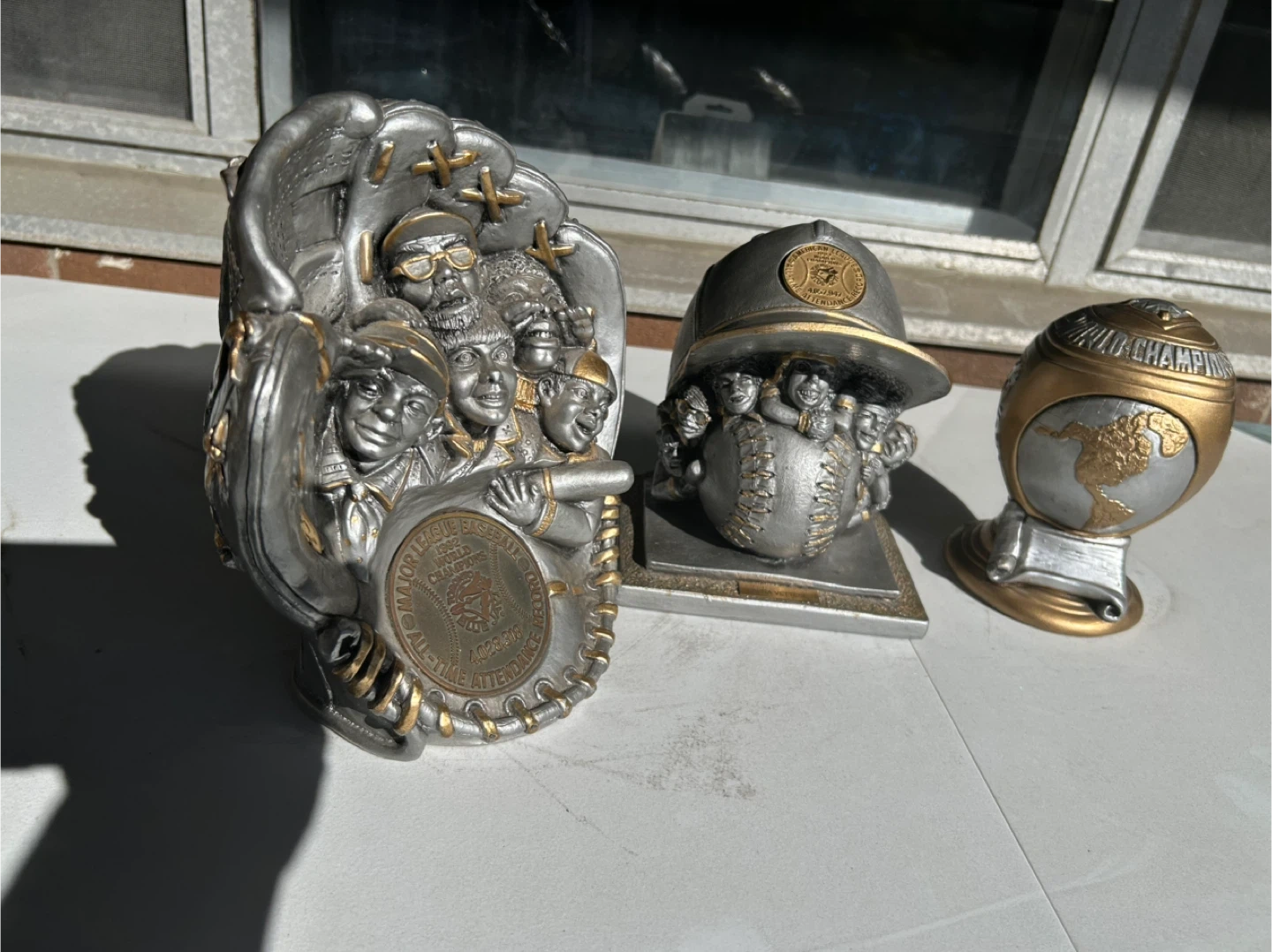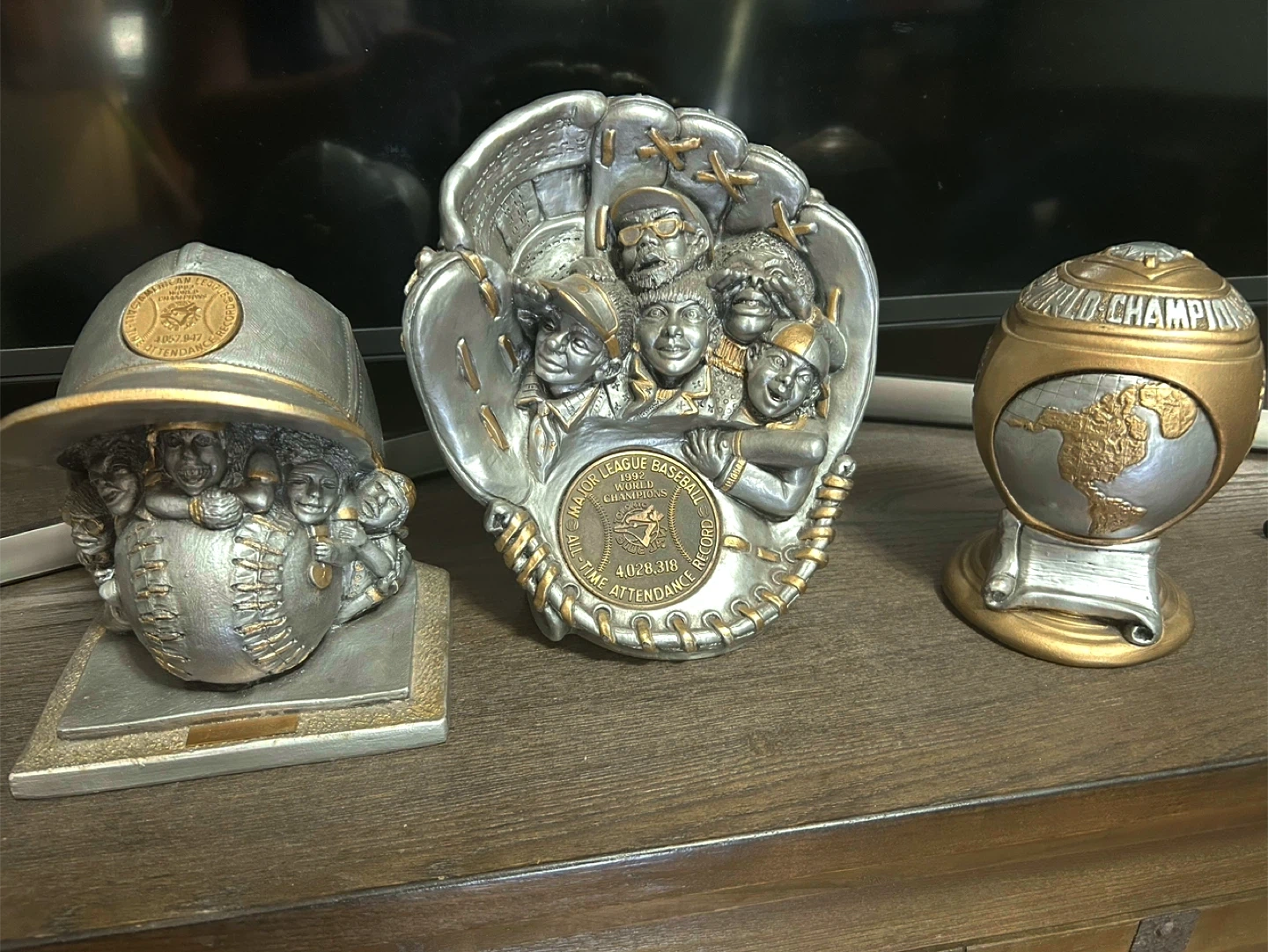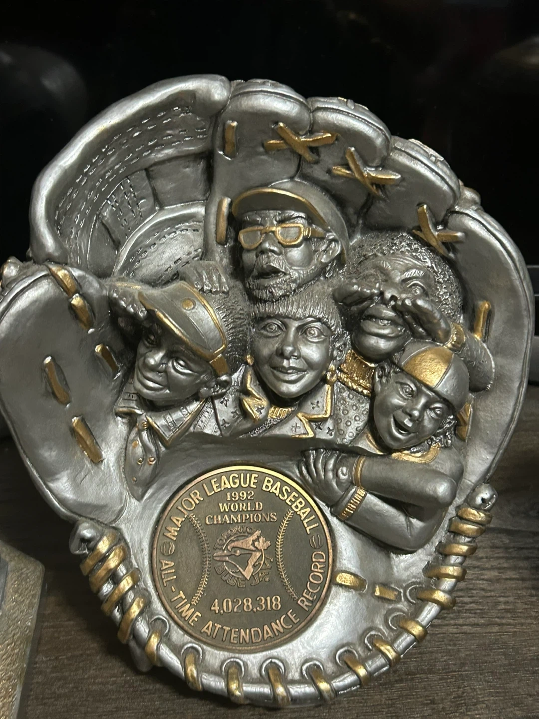 Rare collection of 1992 and 1993 Blue Jays World Series finely crafted sculptures depicting celebration of the 1992 and 1993 World Series MLB champions and stadium attendance records and World Series ring. These were gifted to a Blue Jays employee who worked for the club in those celebratory years and were limited to my knowledge. The nameplates on 1-2 have fallen off over 30+ years in possession but the glove sculpture still retains the name of the Blue Jays employee from that era. The sculptures are quite heavy and range 6-9 inches in height. I am uncertain of the constructive materials but painted mostly in silver, gold or bronze colours. Selling as a set. May consider selling individually down the line if not selling together. You can own this fine collection of Blue Jays history today!