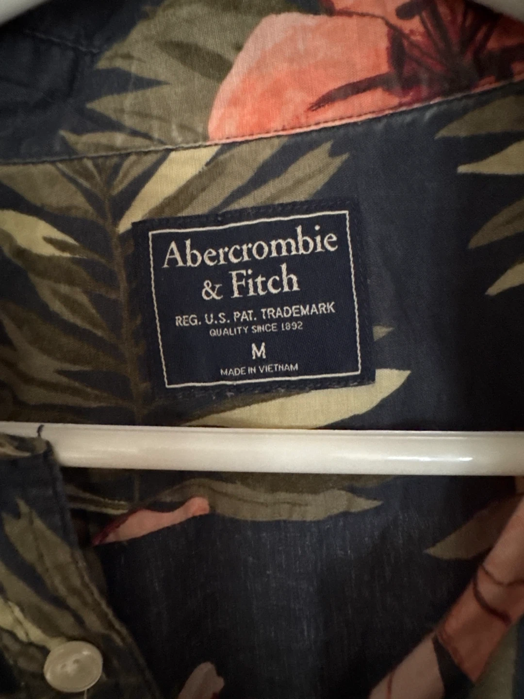 Abercrombie & Fitch short sleeve button-up shirt in size medium. It features a dark blue base with a colourful floral and leaf print. Made in Vietnam.