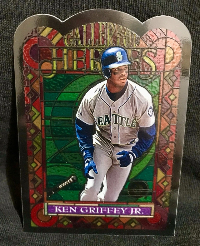 This is a 1997 Topps Gallery Gallery of Heroes baseball card featuring Ken Griffey Jr. when he played for the Seattle Mariners. The card is in great condition and would be a fantastic addition to any baseball card collection. As baseball cards are a nostalgic and timeless collectible, this card of 'The Kid' is sure to bring a smile to your face. If the ad is up, the item is available.