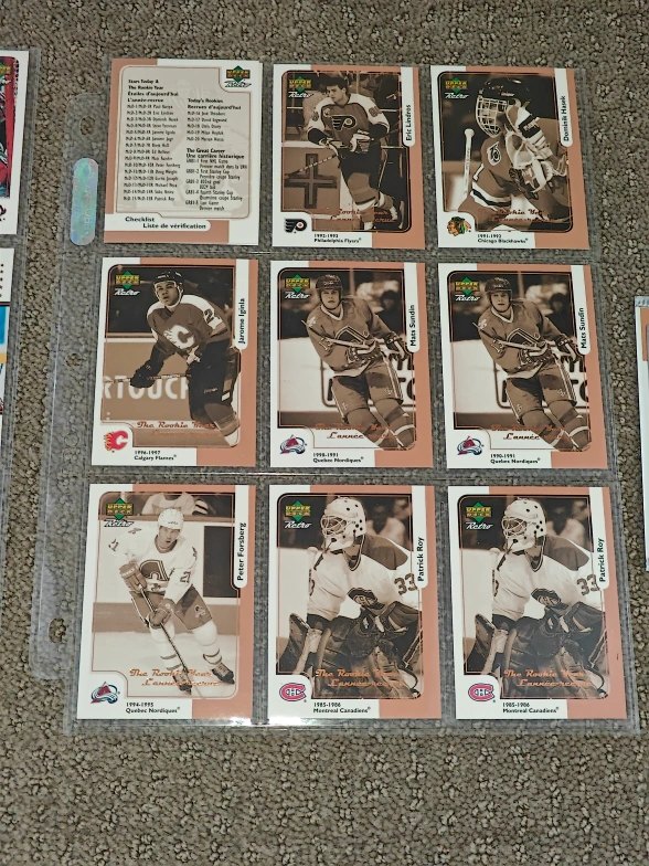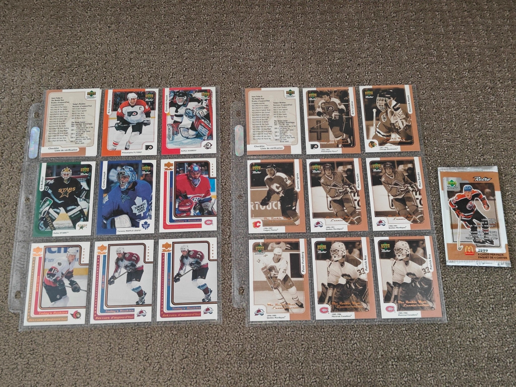 174NOTE: 1999-00 McDonalds Upper Deck Hockey Card Retro Set is NOT a Complete Set, please see list of cards included I am selling a partial set of the 1999-00 McDonalds Upper Deck Retro Hockey Card in excellent condition. 16 Cards. Includes: * 2 - Ultra ProTrading Card Sleeves * 1 - Empty 1999-00 McDonalds Retro Upper Deck Foil Wrapper * 4 - Checklists * McD - 2R - Lindros * McD - 3R - Hasek * McD - 5R - Iginla * McD - 9R - Sundin (2 Cards) * McD - 10R - Forsberg * McD - 15R - Roy (2 Cards) * McD - 2 - Lindros * McD - 3 - Hasek * McD - 8 - Belfour * McD - 12 - Joseph * McD - 16 - Theodore * McD - 18 - Drury (2 Cards) * McD - 20 - Hossa Comes from a pet and smoke-free environment. Pickup in Mount Pleasant (NW Calgary)