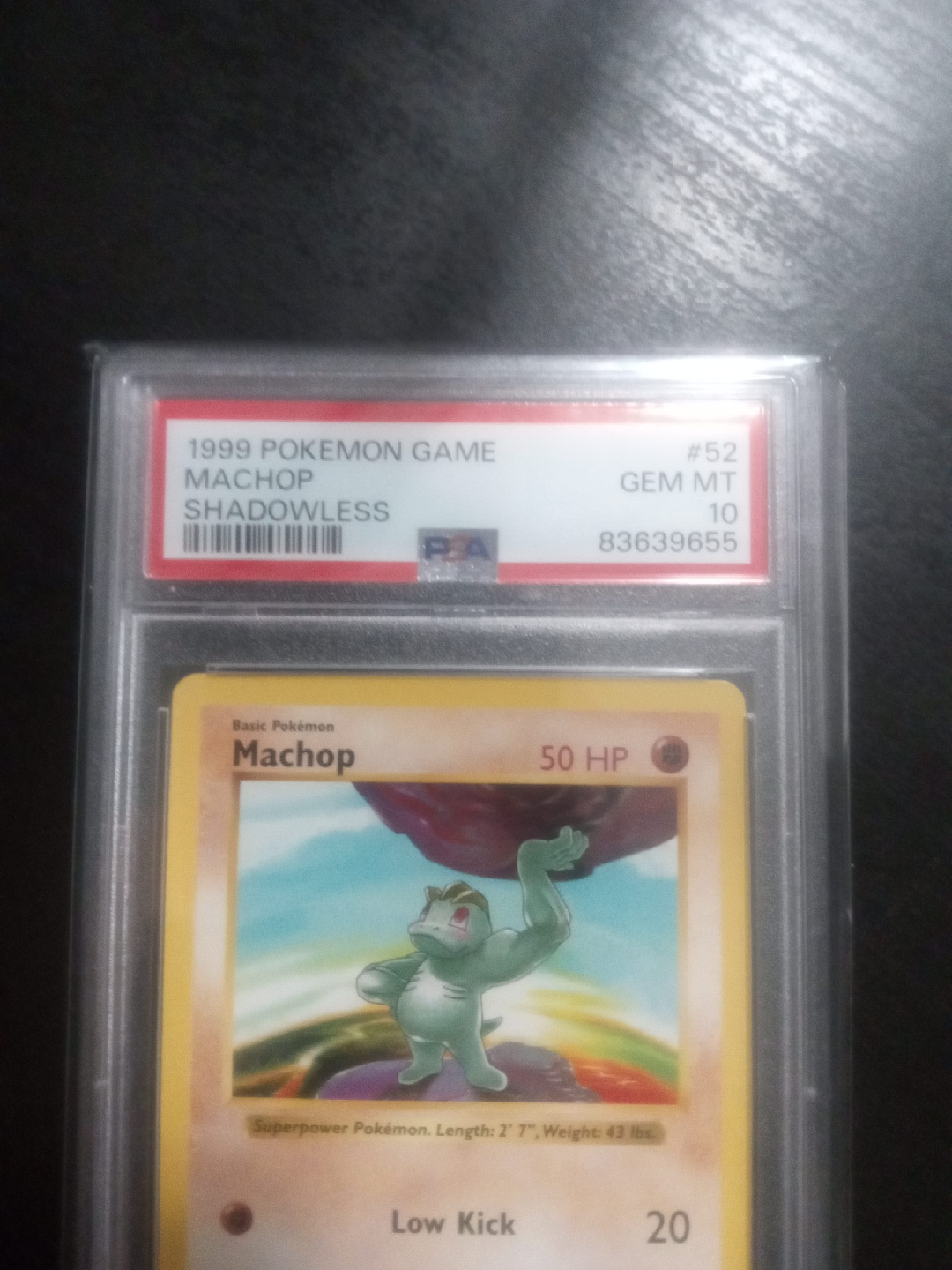 Selling a 1999 Pokemon Game Machop Shadowless card, graded GEM MT 10 by PSA. Card number is #52 and the certification number is 83639655