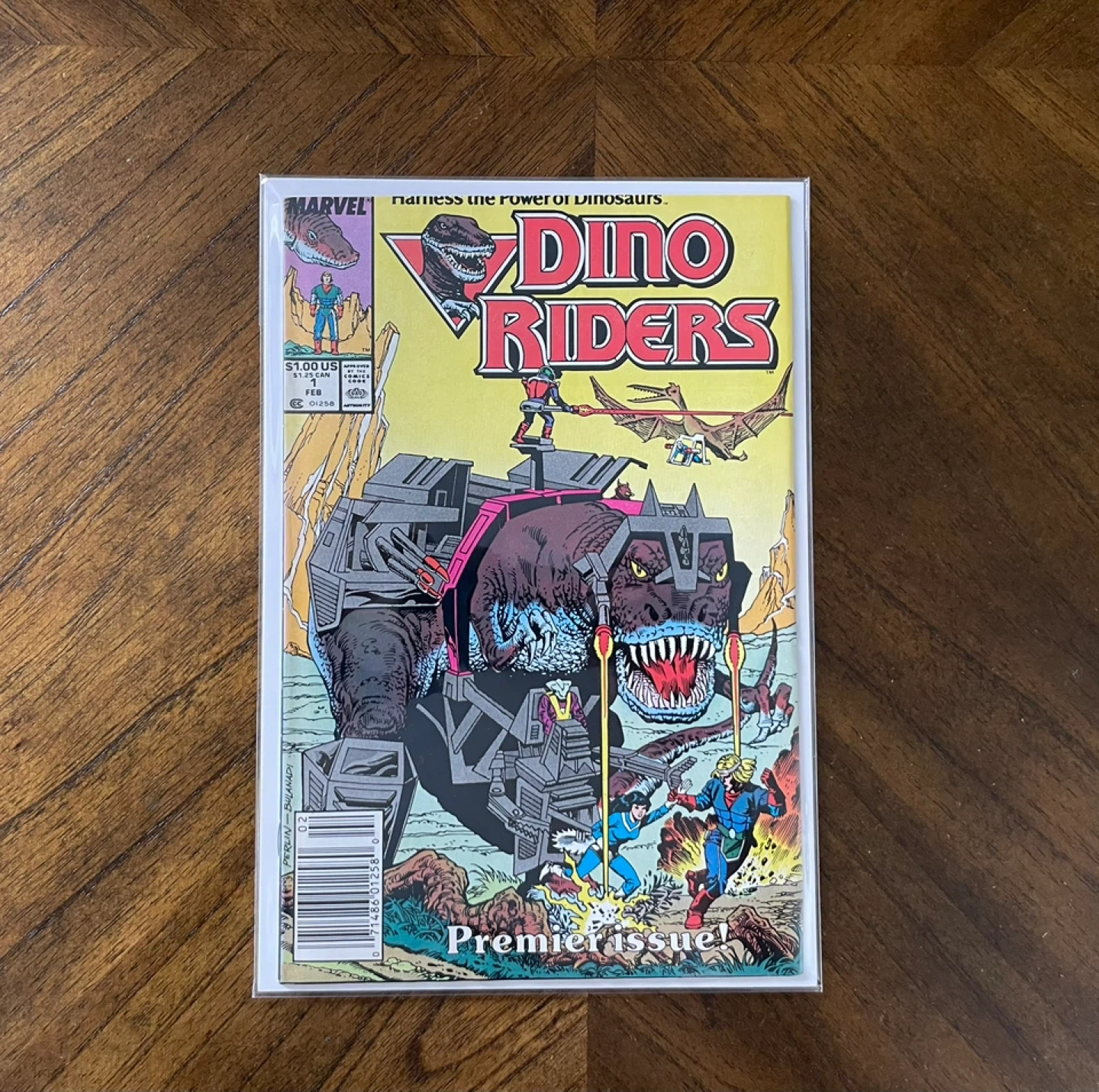 Dino-Riders comic book, premier issue. Published by Marvel Comics, it features dinosaurs and riders. This comic is from February 1987.