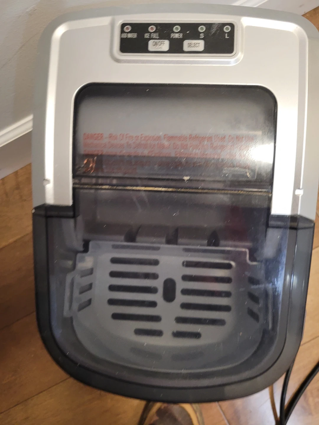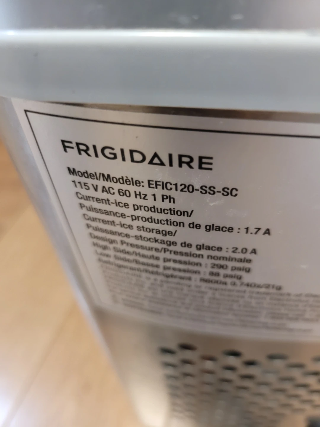 This Frigidaire ice maker produces up to 26 lbs. of bullet-shaped ice cubes per day. It has a current ice storage capacity of 1.7 A. The machine is stainless steel.