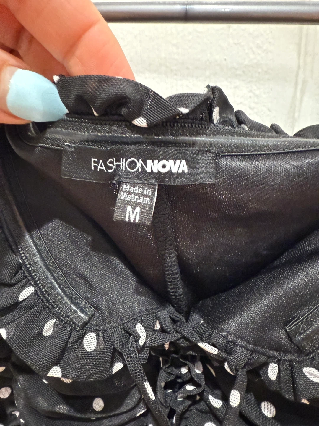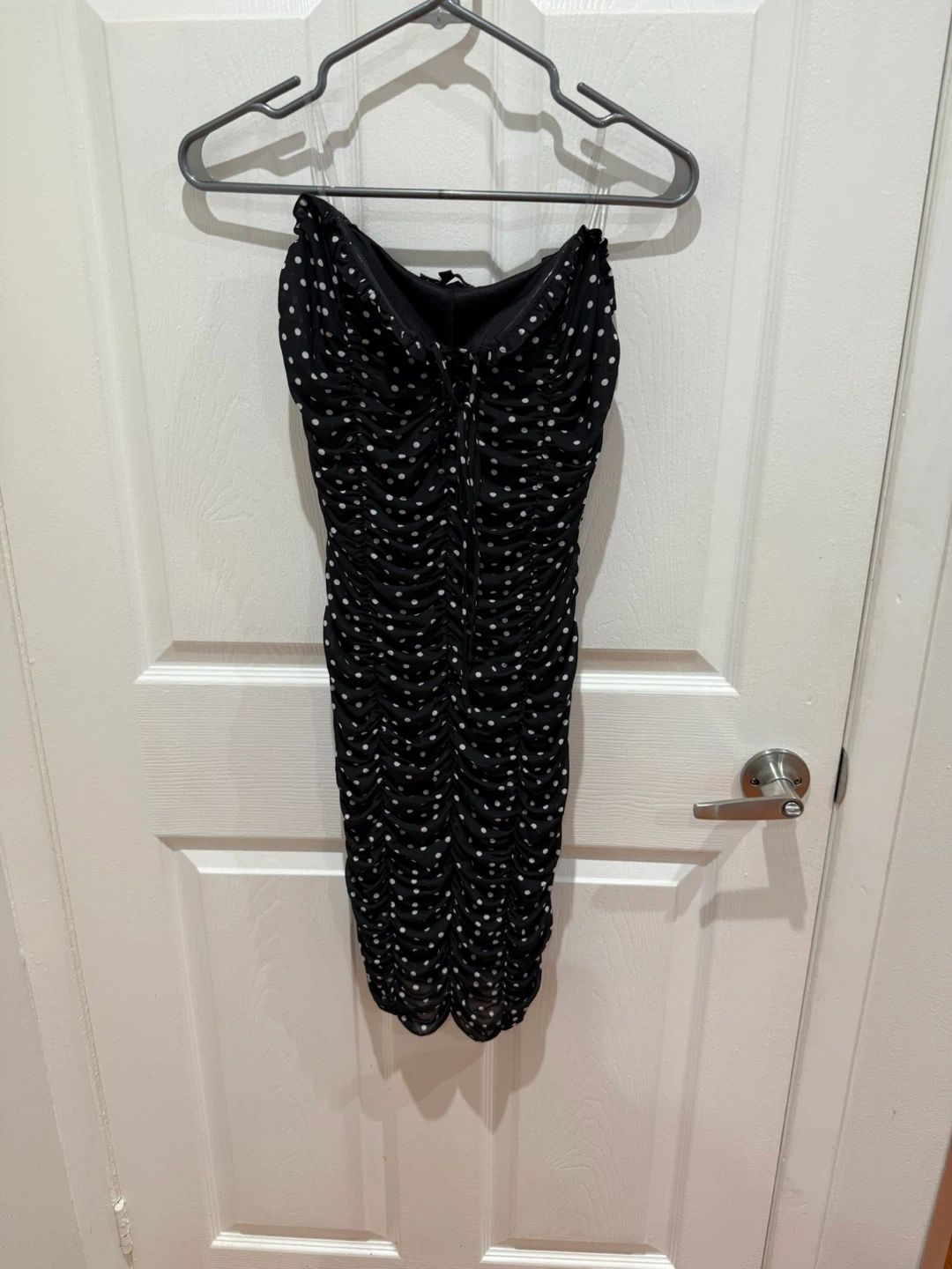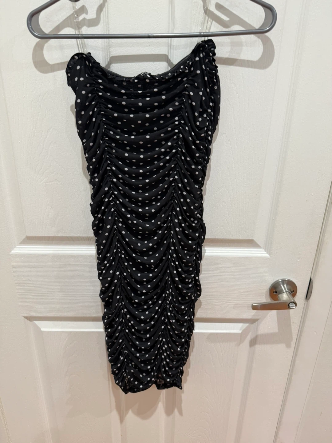 Strapless mini dress. Ruched bodice. Polka dot pattern. Size medium.
