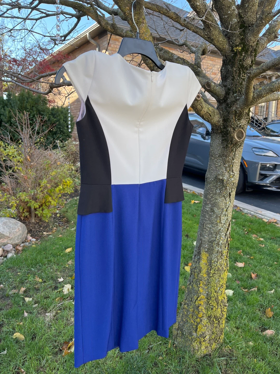 Selling a cute 9&Co. dress in size 4. The dress features a lovely colour block design with white, black, and blue. Perfect for any occasion!