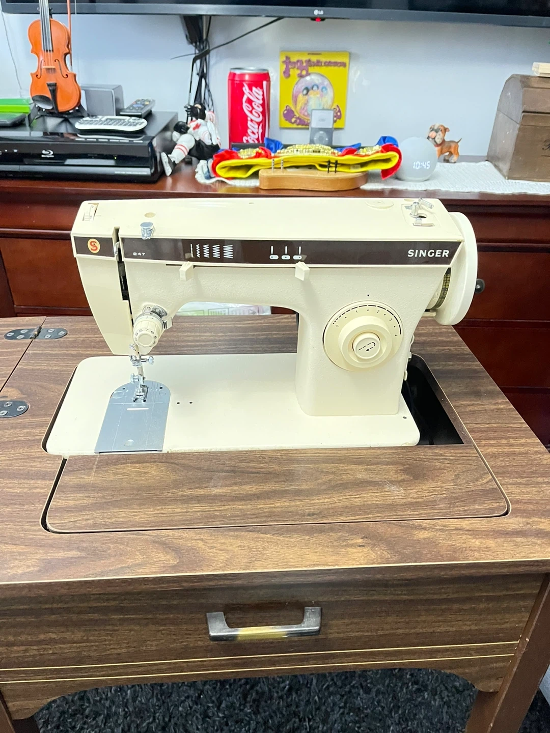 This is a vintage Singer sewing machine with its original cabinet. It's a cream-coloured model, likely from the mid-20th century. The cabinet has a dark wood finish and a fold-out extension leaf. It comes with a drawer for storage. A great piece for any crafter!