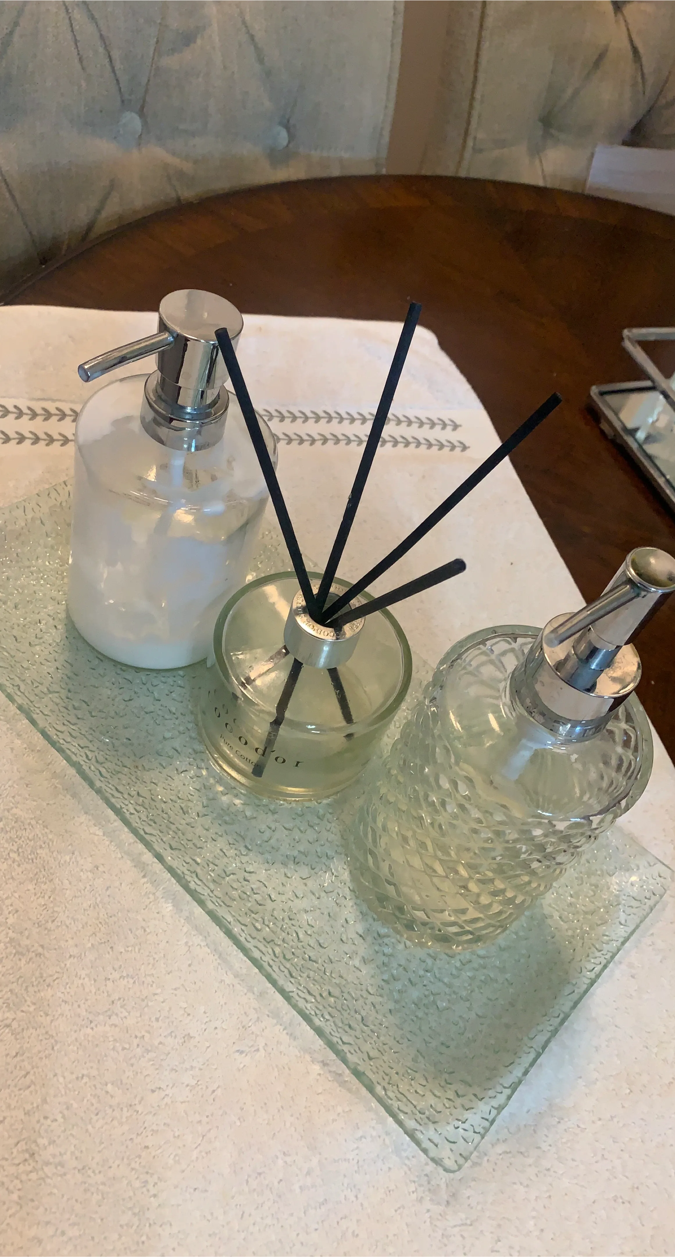 This set includes a Copa d'Or Pure Cotton reed diffuser and a glass soap dispenser with a chrome pump. The diffuser has black reeds and a glass bottle with a textured diamond pattern. Both items are presented on a textured glass tray.