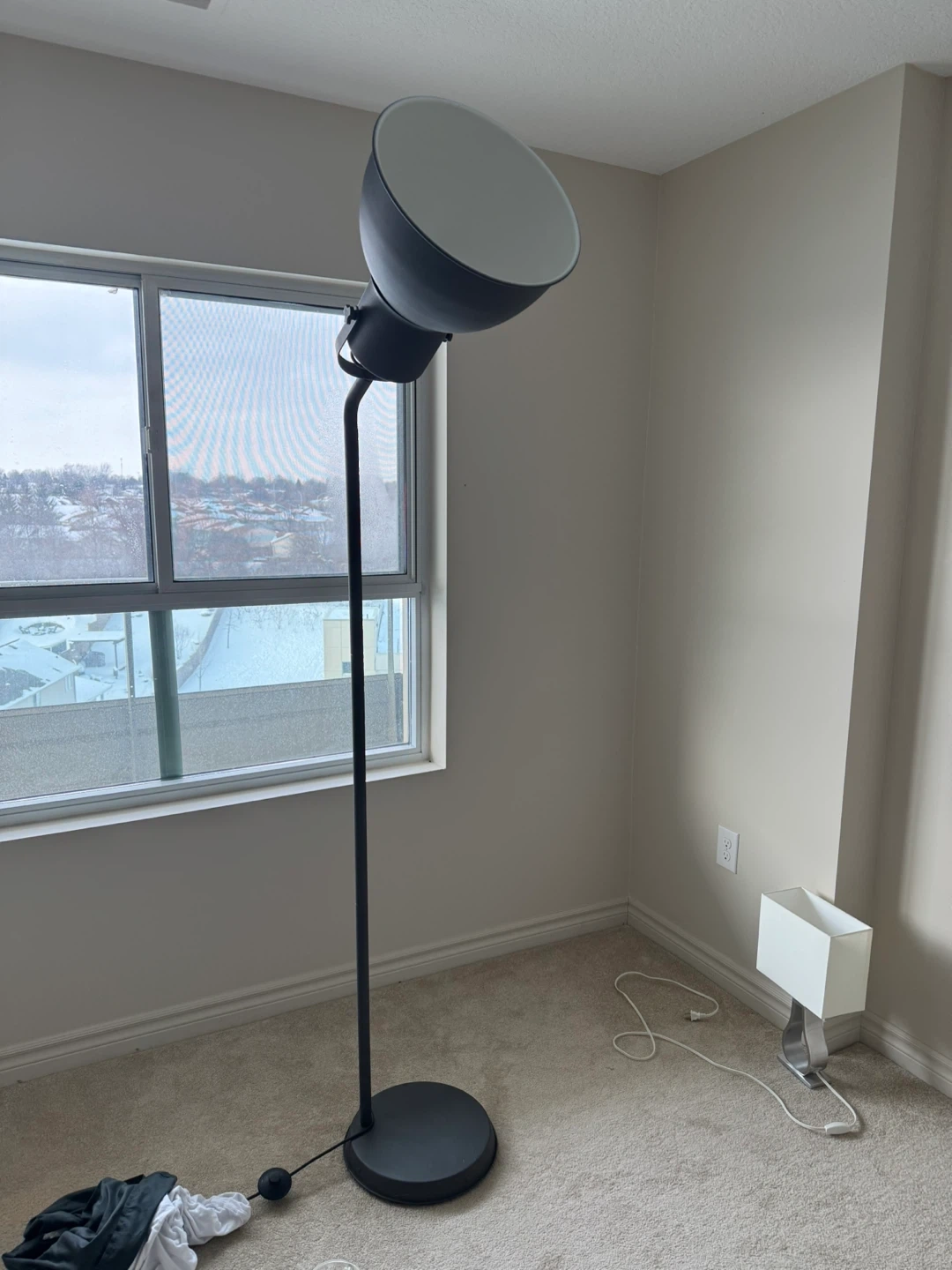 P1- An IKEA tall black floor lamp with a round base. It features an adjustable head for directing light.