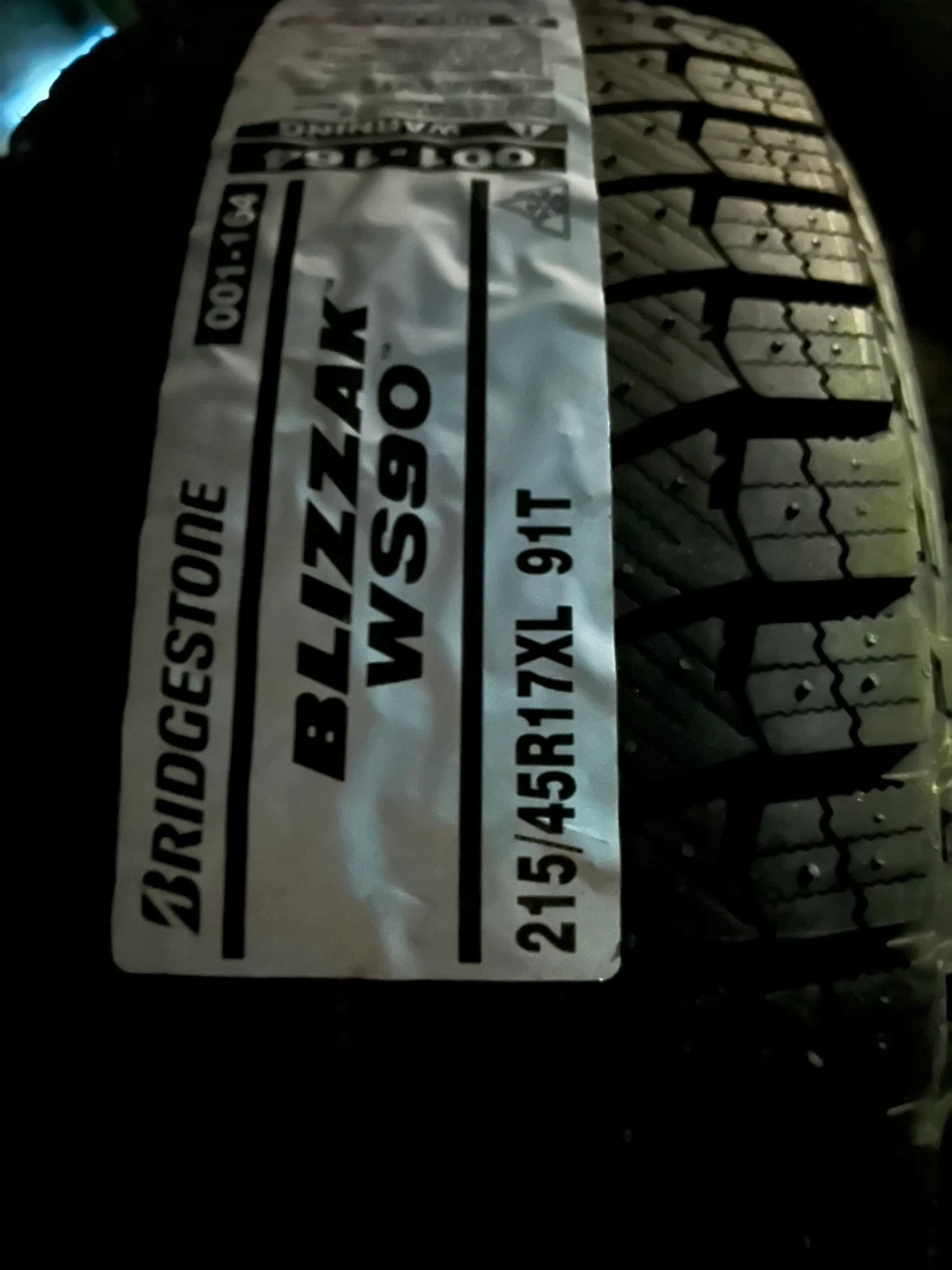 Selling a set of Bridgestone Blizzak WS90 winter tires, size 215/45R17XL 91T. These tires are designed to provide excellent grip and handling in snowy and icy conditions. Perfect for winter driving!