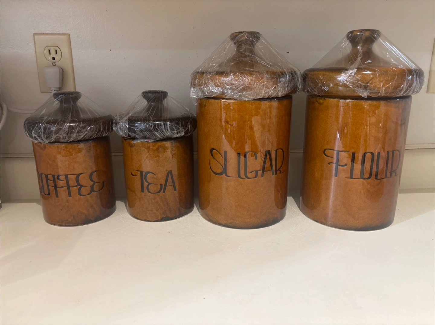 Selling a vintage canister set for your kitchen! Includes four canisters labeled 'Coffee,' 'Tea,' 'Sugar,' and 'Flour'