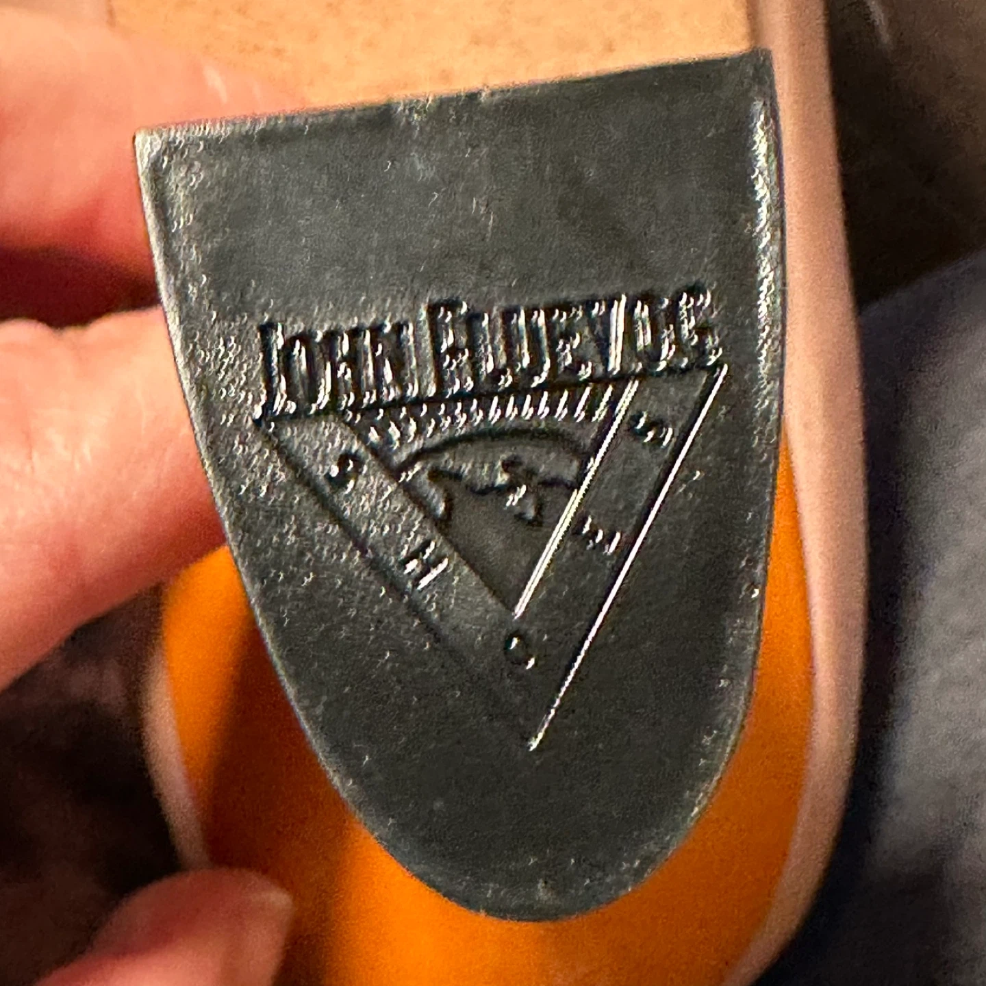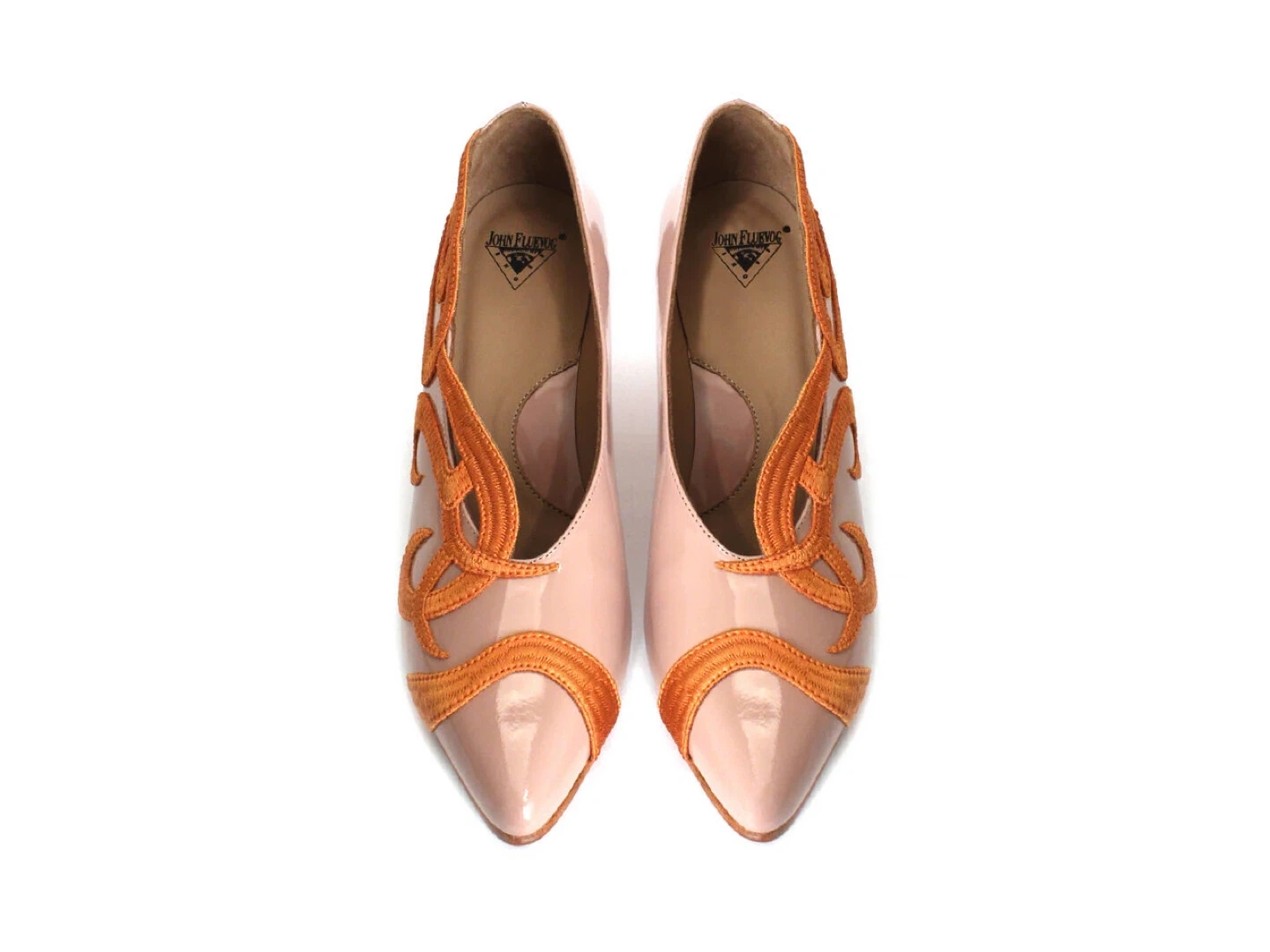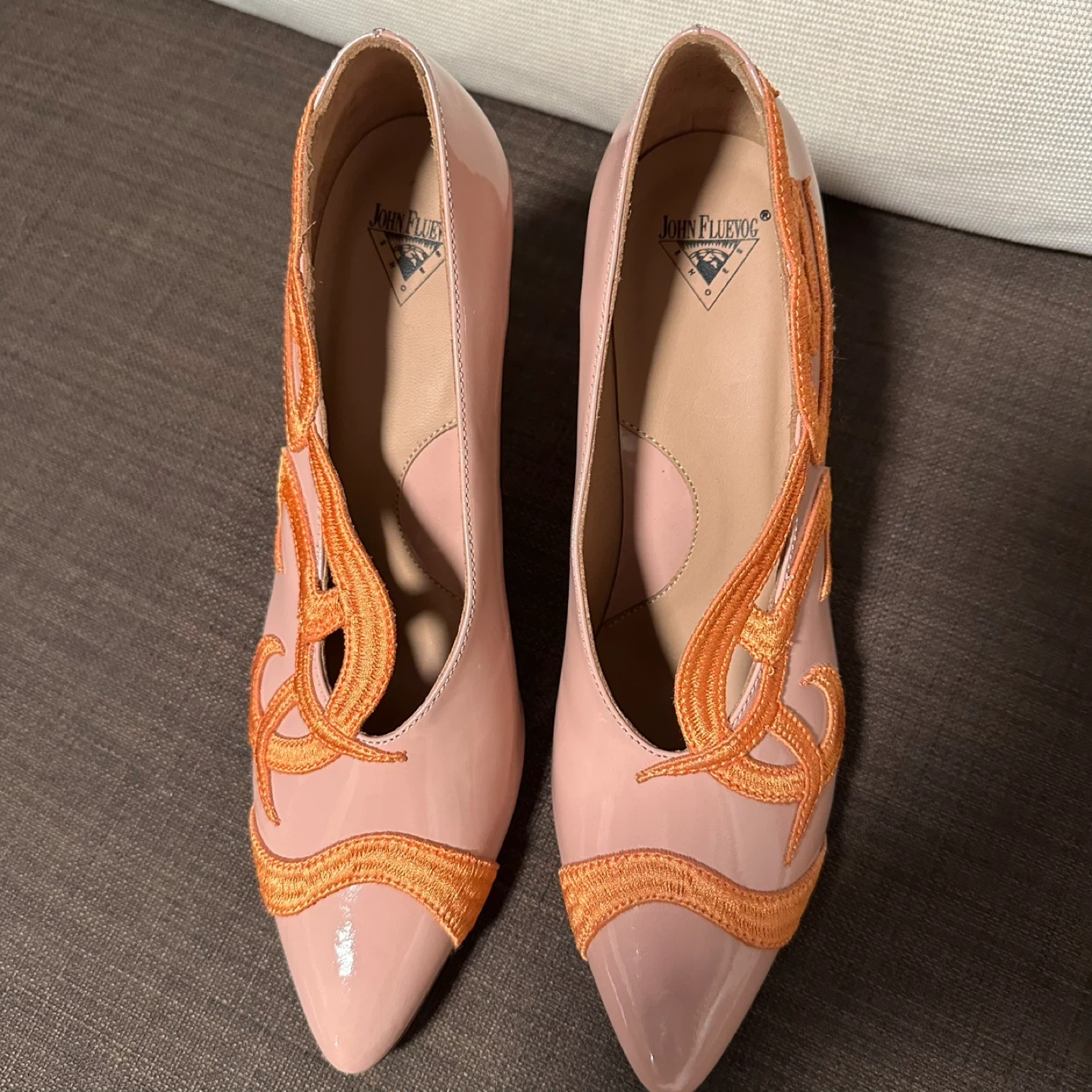 Size 7.5 These are a pair of John Fluevog Hotchkiss embroidered pumps. They feature a unique design with orange embroidery and a distinctive heel shape. They are new, never worn.
