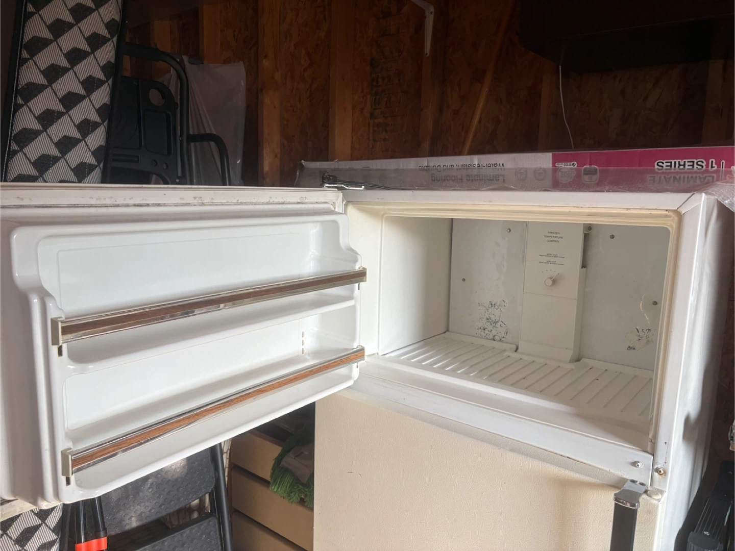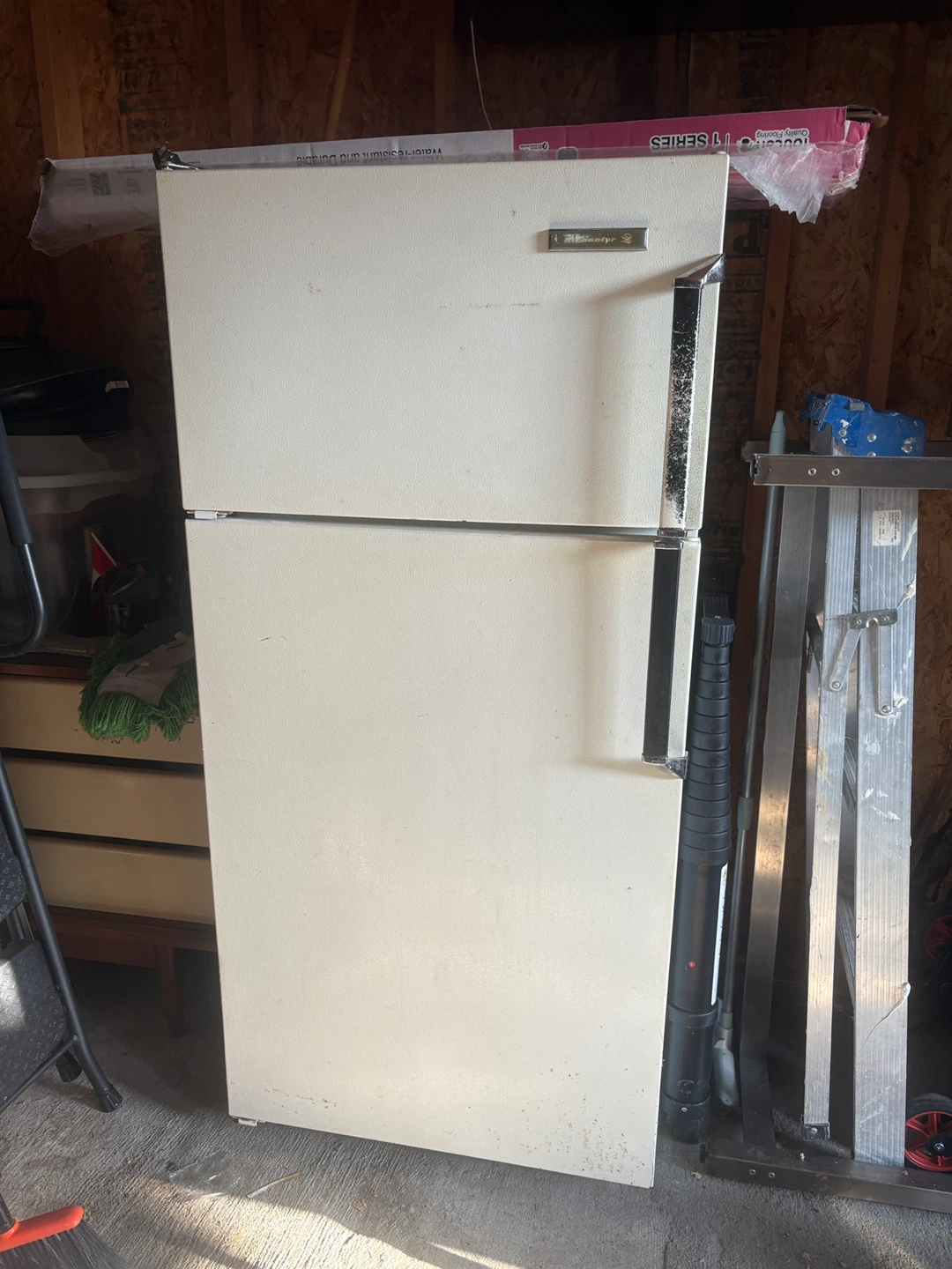 Selling a vintage McClary refrigerator. It's white and has a top freezer compartment. It shows signs of use, but it's still functional.