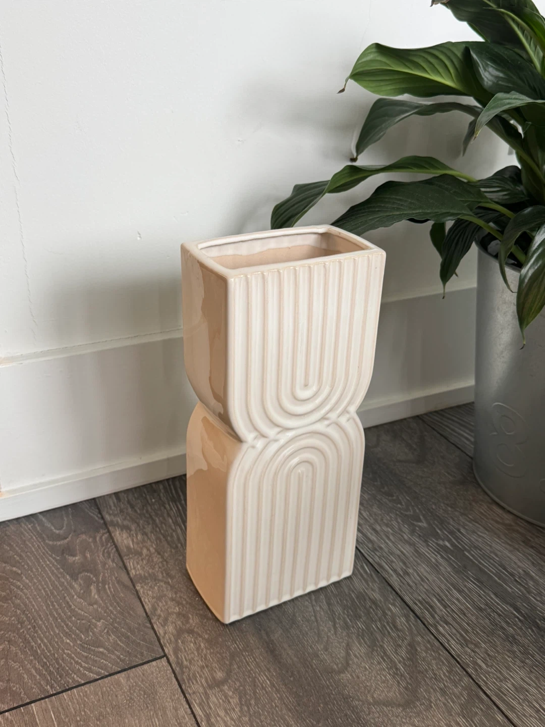 A neutral beige ceramic vase featuring a ribbed arch design. It's perfect for displaying dried flowers or small plants. This decorative piece adds a touch of modern style to any shelf or tabletop.