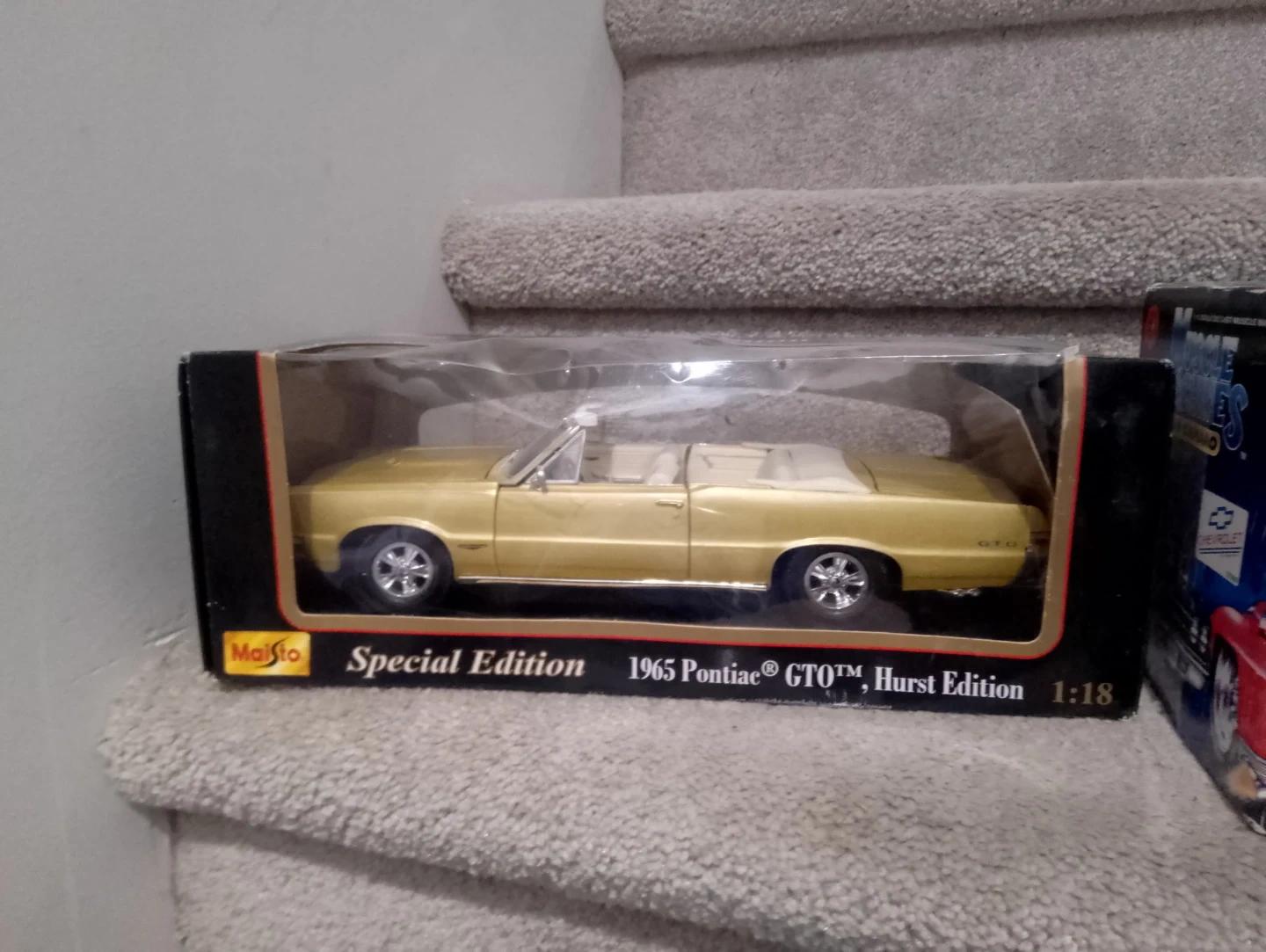 This is a Maisto 1:18 scale diecast model of a 1965 Pontiac GTO Hurst Edition convertible. It's a special edition .This collectible model car comes in its original packaging.