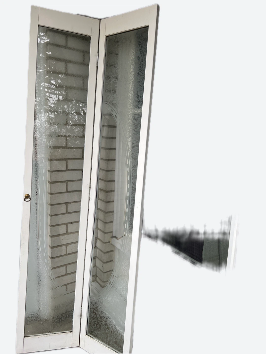 Selling a pair of white bi-fold doors. They feature frosted glass with an oval etched design. Hinges are included.
