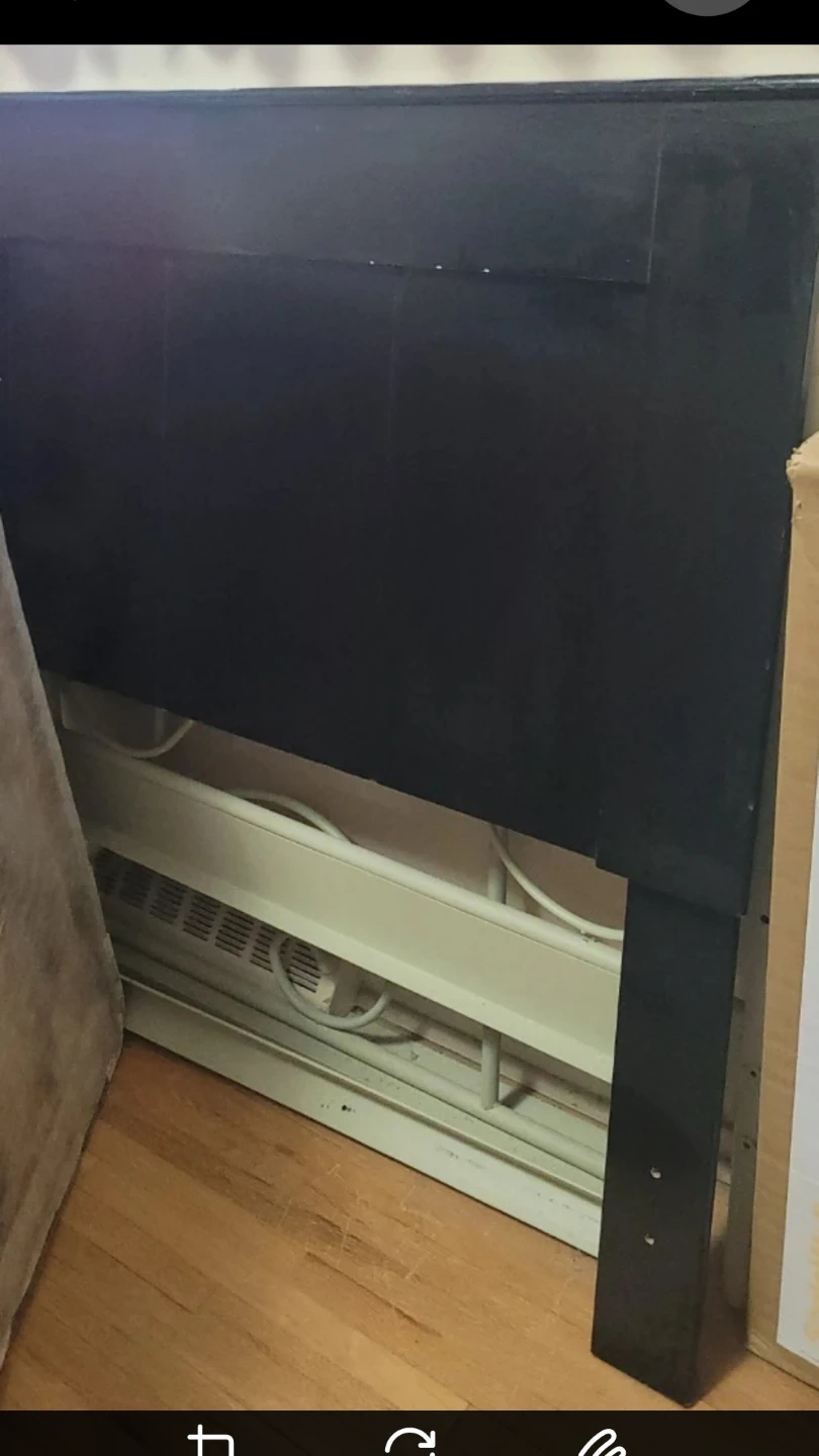 This is a black headboard. It's made of wood. It's a nice addition to a bedroom. Could use a few black touch ups or paint a new color.