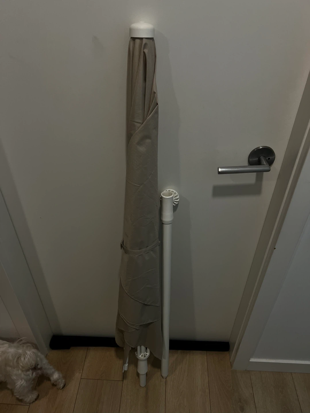 A tan patio umbrella is folded for storage. It includes a white pole that fits into the umbrella. This umbrella is great for providing shade on a sunny day.