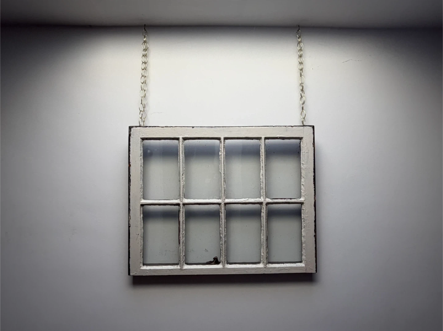 Decorative vintage window pane. Features eight individual panes and hangs from a metal chain. It's perfect for adding a rustic touch to your decor. This piece is made of glass and wood.