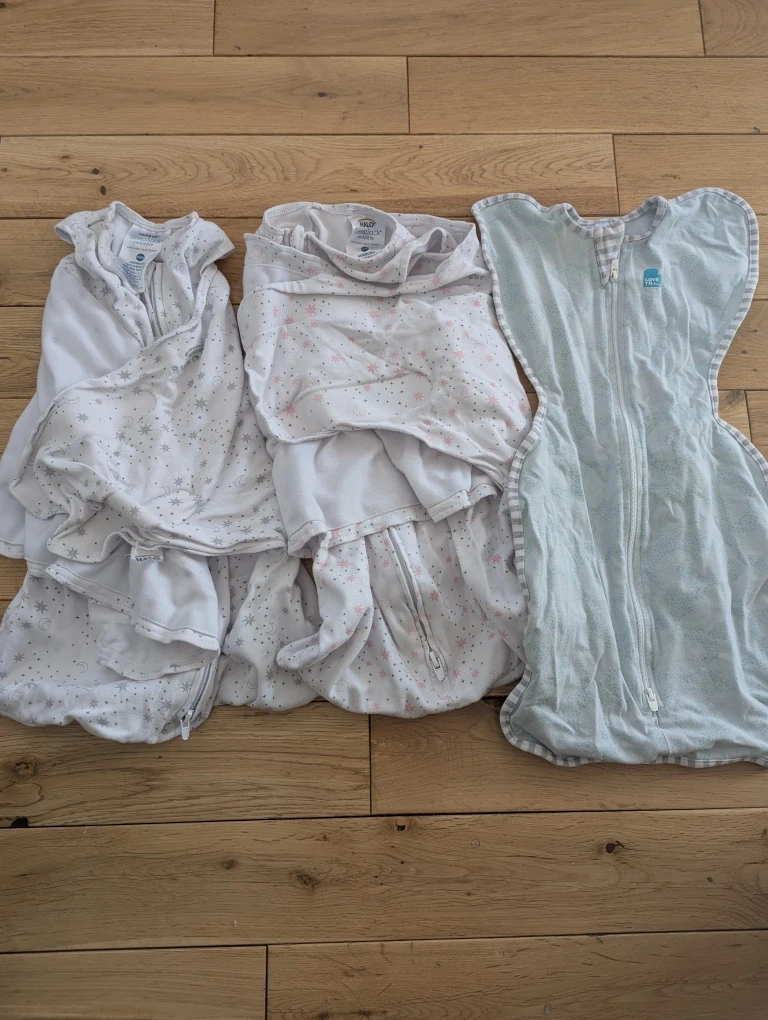 Bundle of three Halo sleep sacks. Two are swaddles with star and moon patterns, and one is a sleeveless sleep sack in light blue. They're all zippered for easy use.
