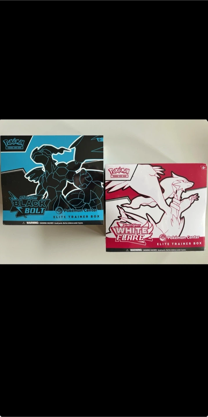 Two Pokémon Elite Trainer Boxes are available: the Black Bolt and the White Flare versions. These are from the Scarlet & Violet series. Both boxes are Pokémon Center exclusive.