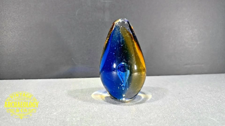 This colorful and eye-catching blue and amber controlled bubble glass paperweight originates from Italy.