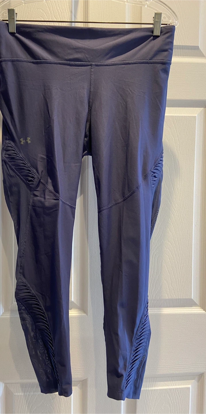 Under Armour cropped athletic leggings in a deep blue colour. They feature ruched mesh panels on the sides for added style and breathability. Made from a stretchy, moisture-wicking fabric for comfort during workouts.
