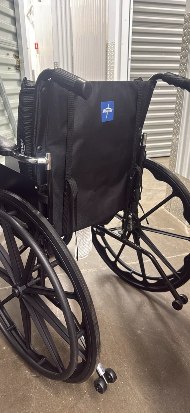 This is a black Medline manual wheelchair. It has large rear wheels and smaller front casters for easy maneuverability. Padded armrests and back support offer comfort. It's designed for easy folding for transport.