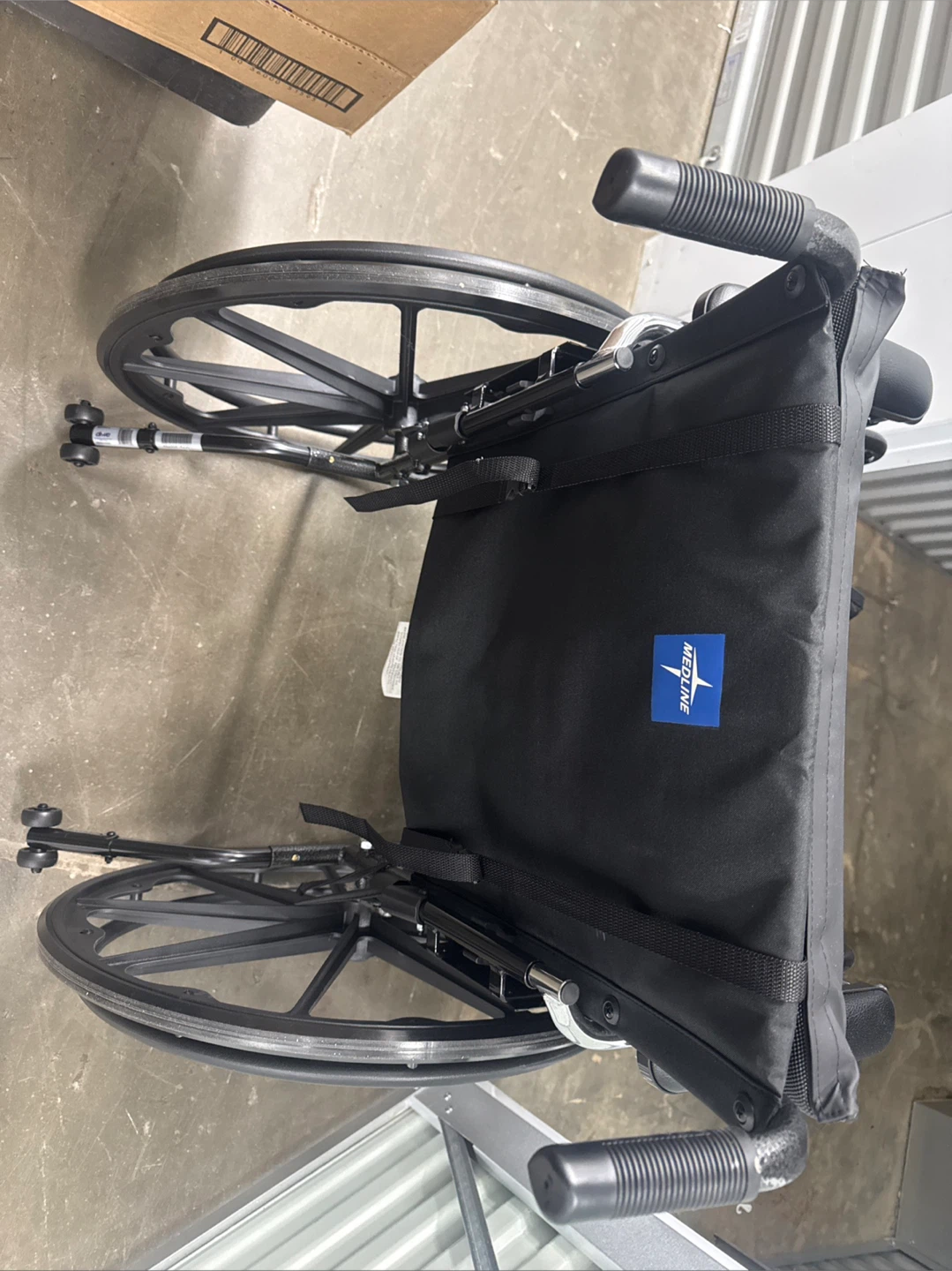 This is a black Medline manual wheelchair. It has large rear wheels and smaller front casters for easy maneuverability. Padded armrests and back support offer comfort. It's designed for easy folding for transport.