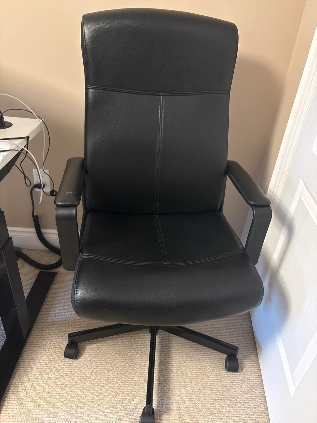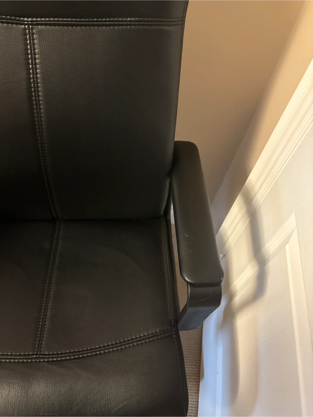 Selling a black office chair in good condition. It has a high back for comfortable support during long workdays. There are some minor signs of wear on the armrests, but otherwise it's in great shape!