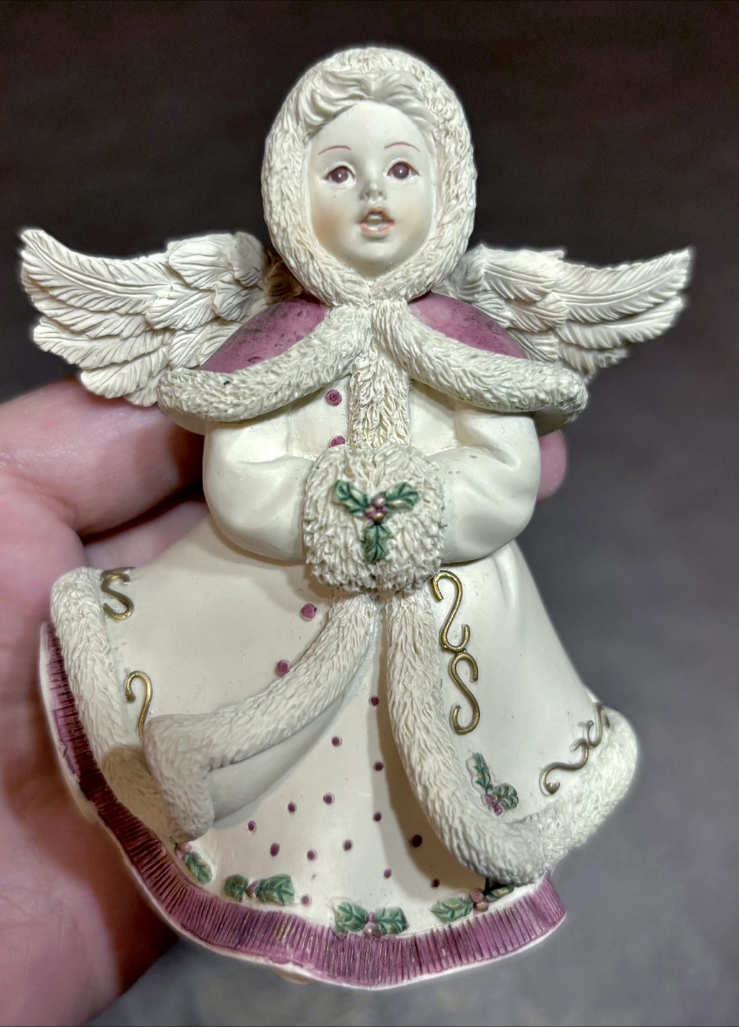 This figurine depicts an angel dressed in winter attire, featuring a fur-trimmed hood and coat, and holding a pomander decorated with holly.