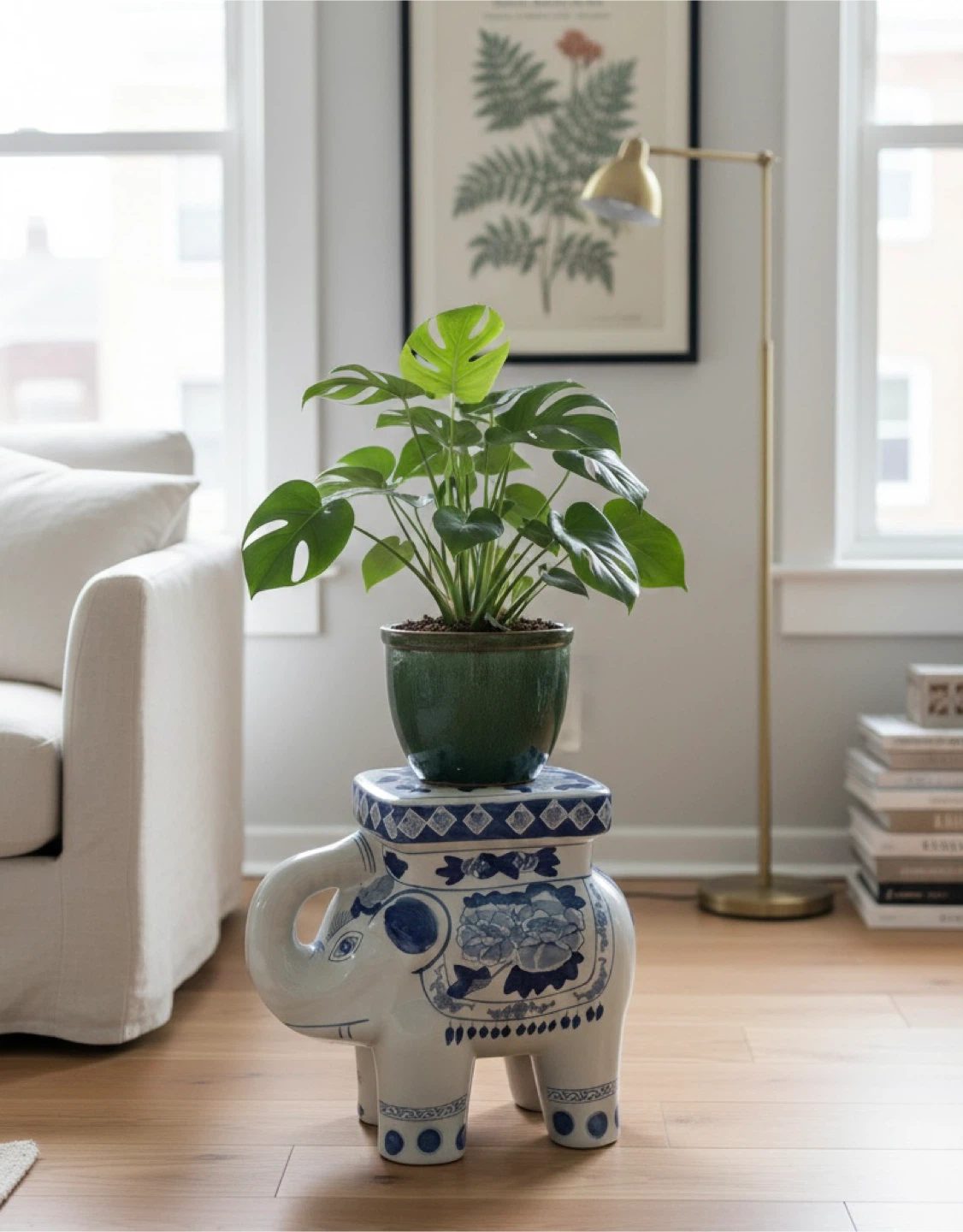 Elephant Garden Stool with Blue and White Floral Design