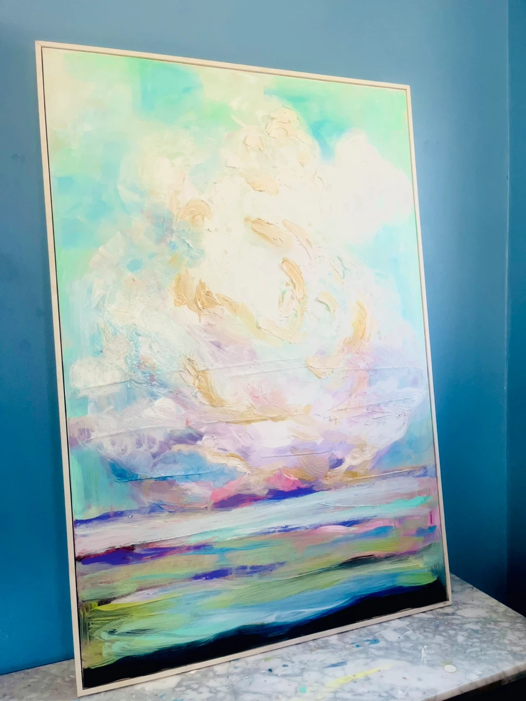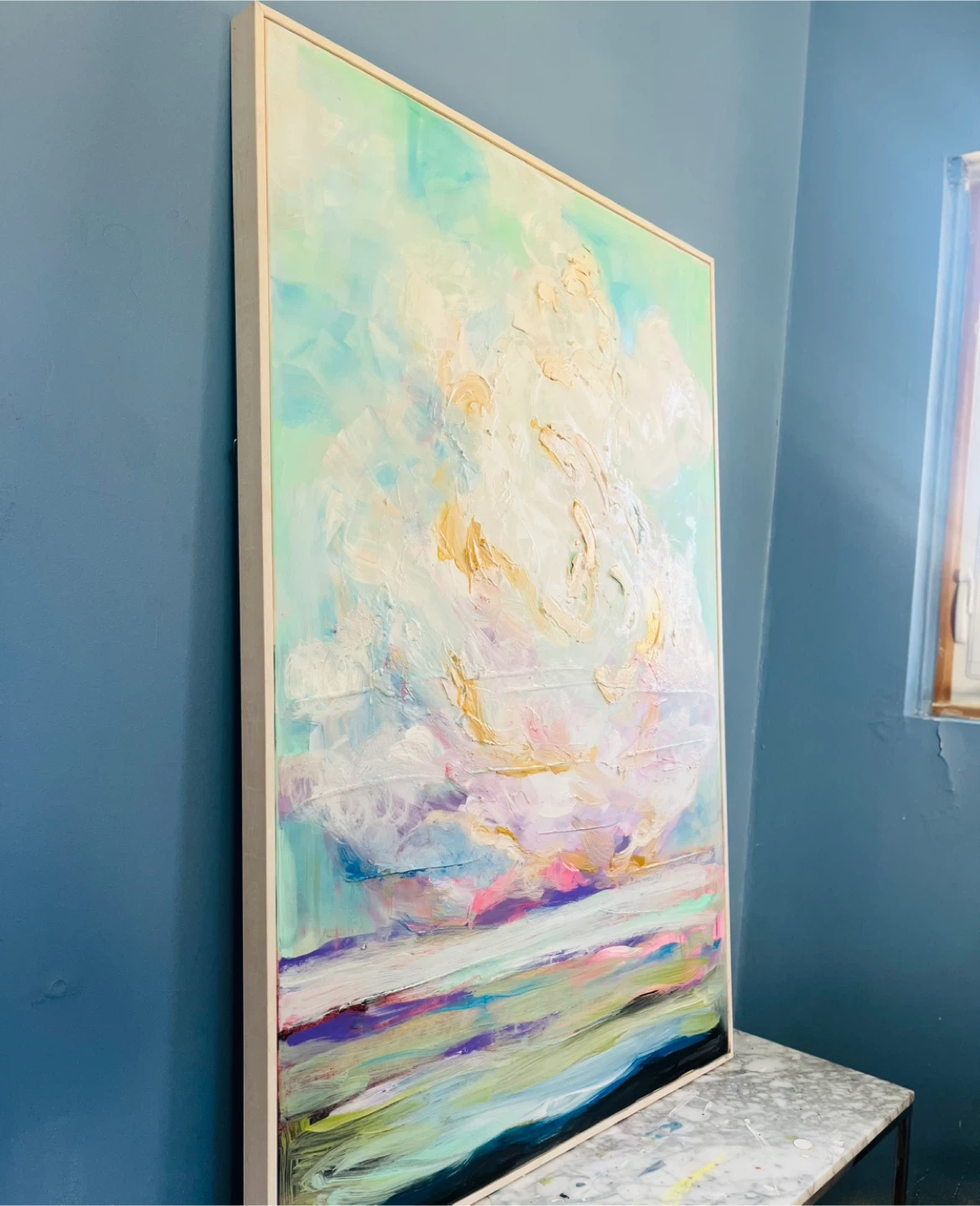Large abstract painting featuring soft pastel colours. Textured impasto technique used for clouds and water.