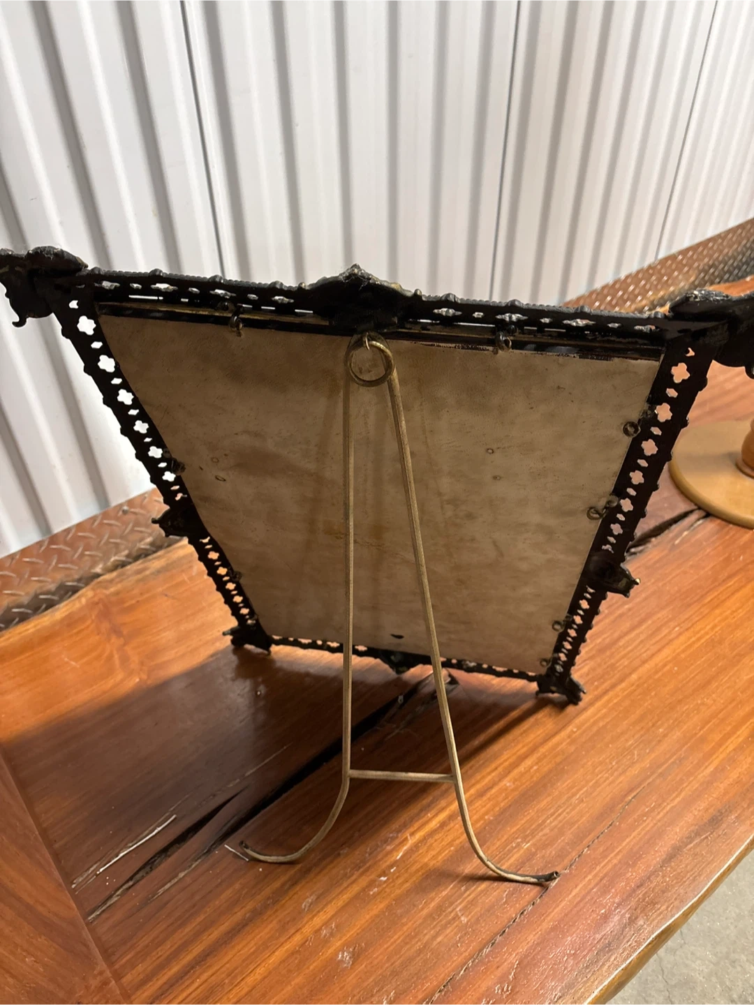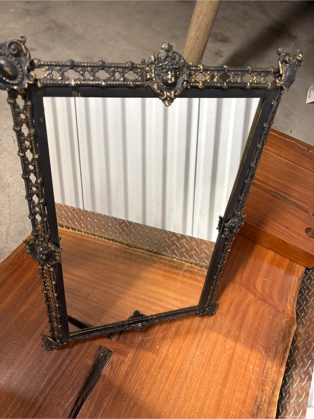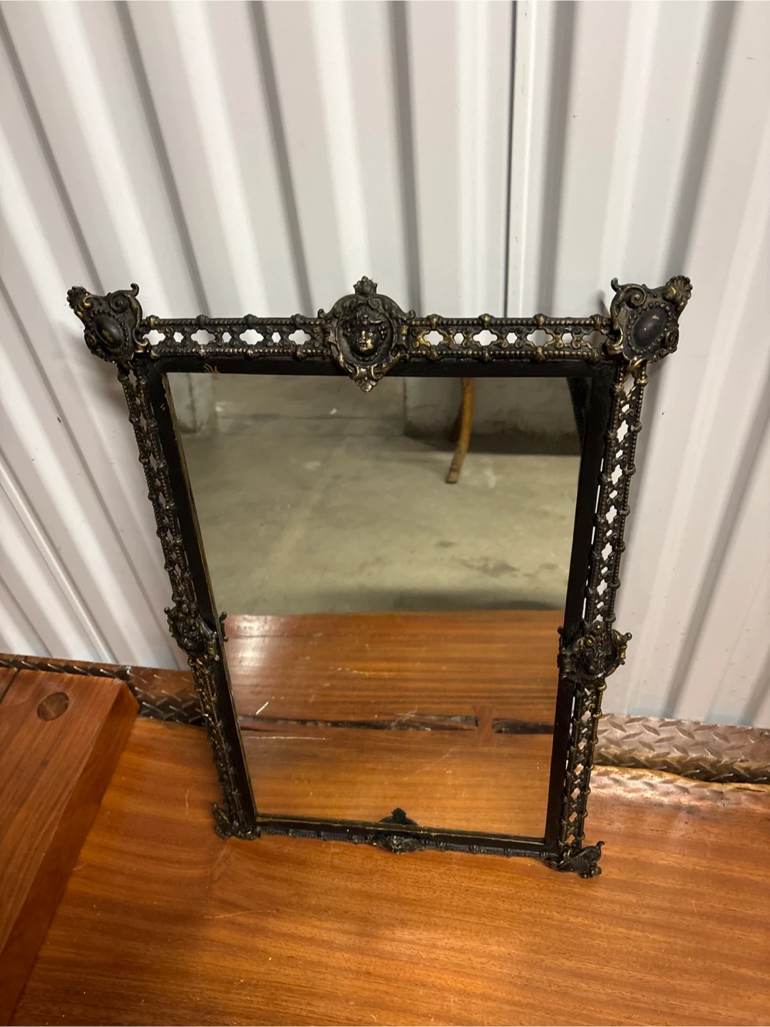 Decorative vanity mirror with an ornate black and solid brass frame. Features intricate detailing and a central Medusa head design. It has an easel back for tabletop or floor display.