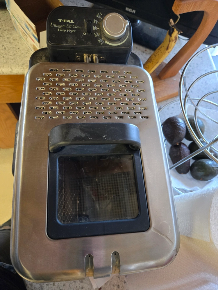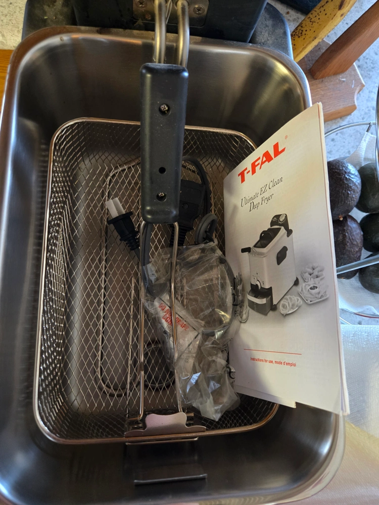 Stainless steel deep fryer. Includes instruction manual and fry basket. Shows some signs of use.